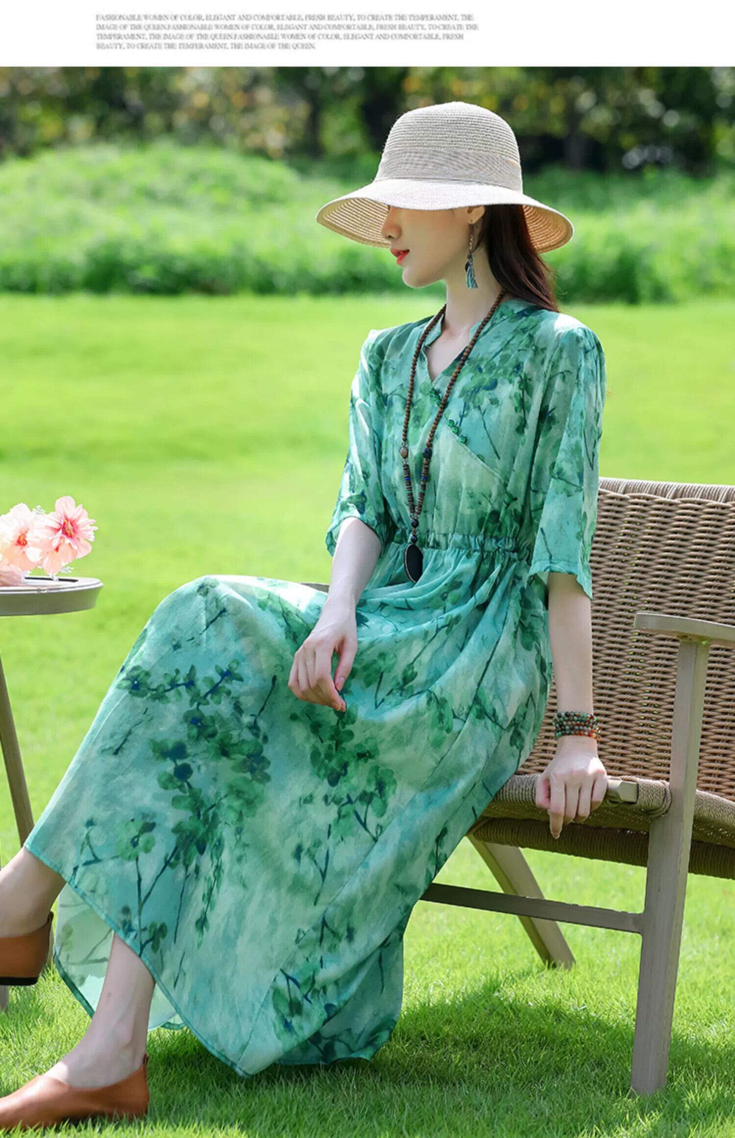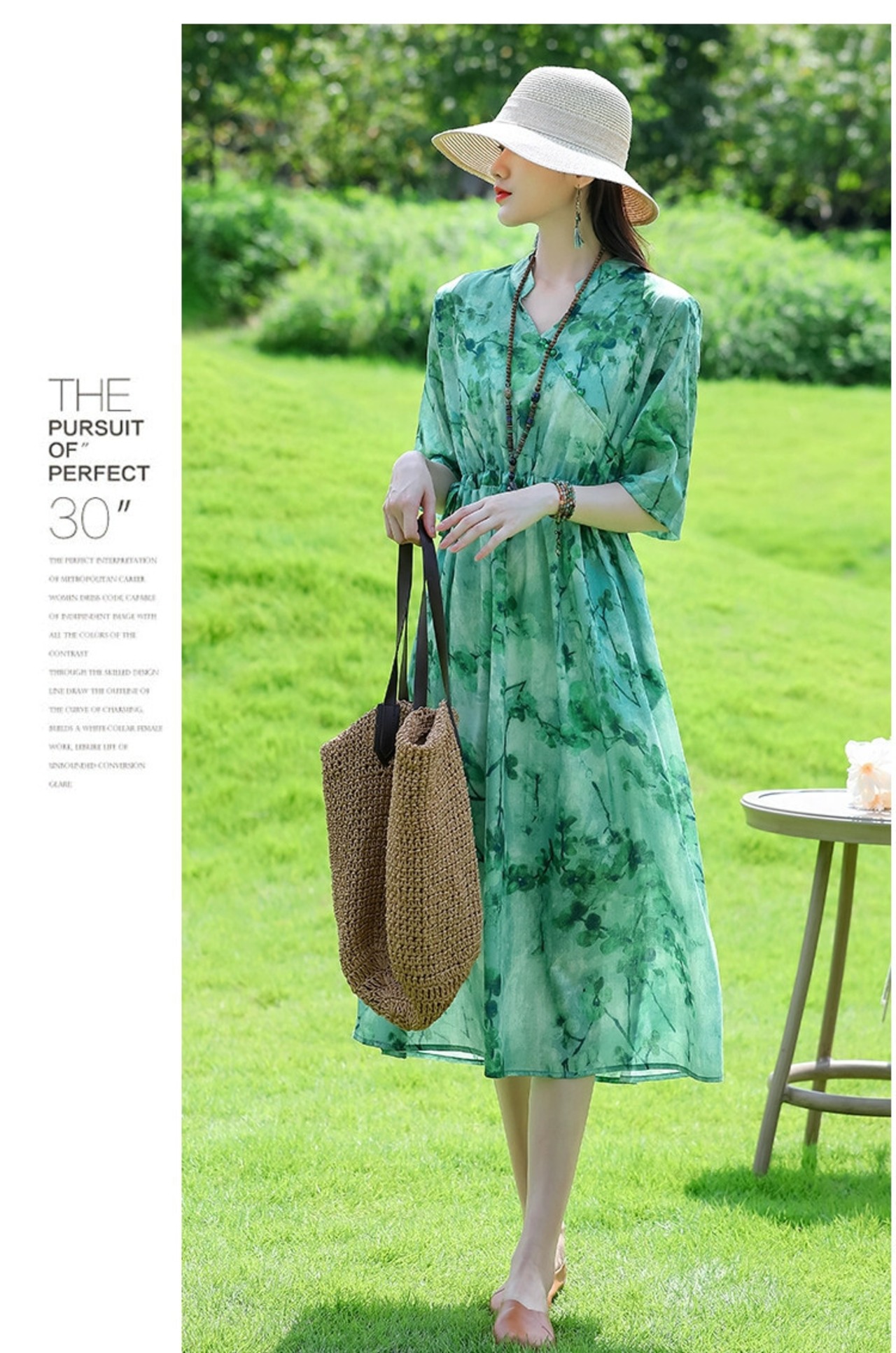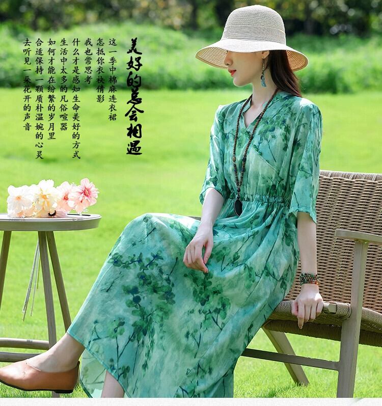 eign trade イタリアブランドテールグッズカットレーベル気質ウエストコットンリネンドレスルーズフローラルVネックラミーロングスカート 花柄 sine30831678448