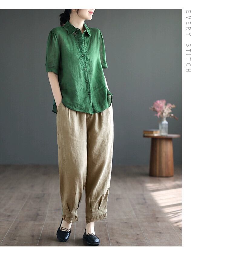 ビッグブランドテールグッズのクリアランスカウンター削除刺繍リネン七分袖シャツ女性レトロルーズコットンとリネン刺繍トップ レッド sine47205544450