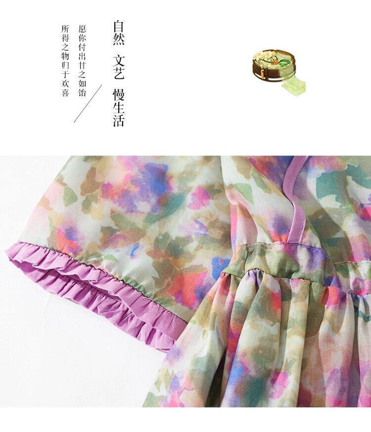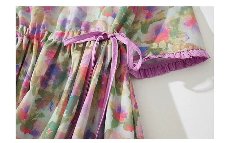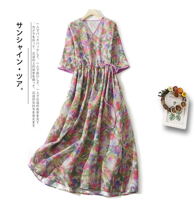 クリアランスリーク ~ 既製の女性用ラミー花柄半袖ドレス、ウエストタイ付き V ネックコットンとリネンのロングスカート Vネック sine48936475225