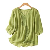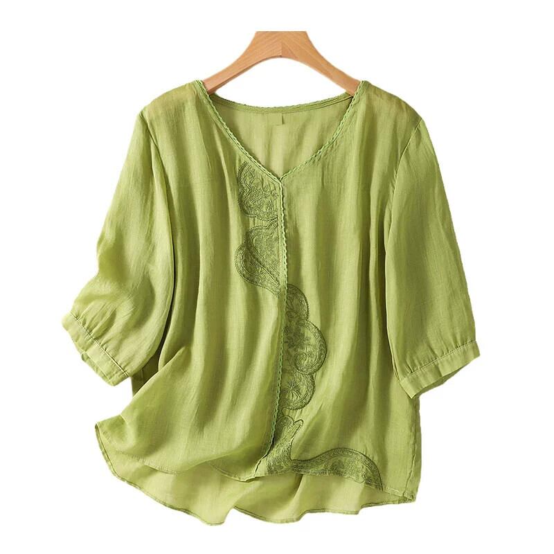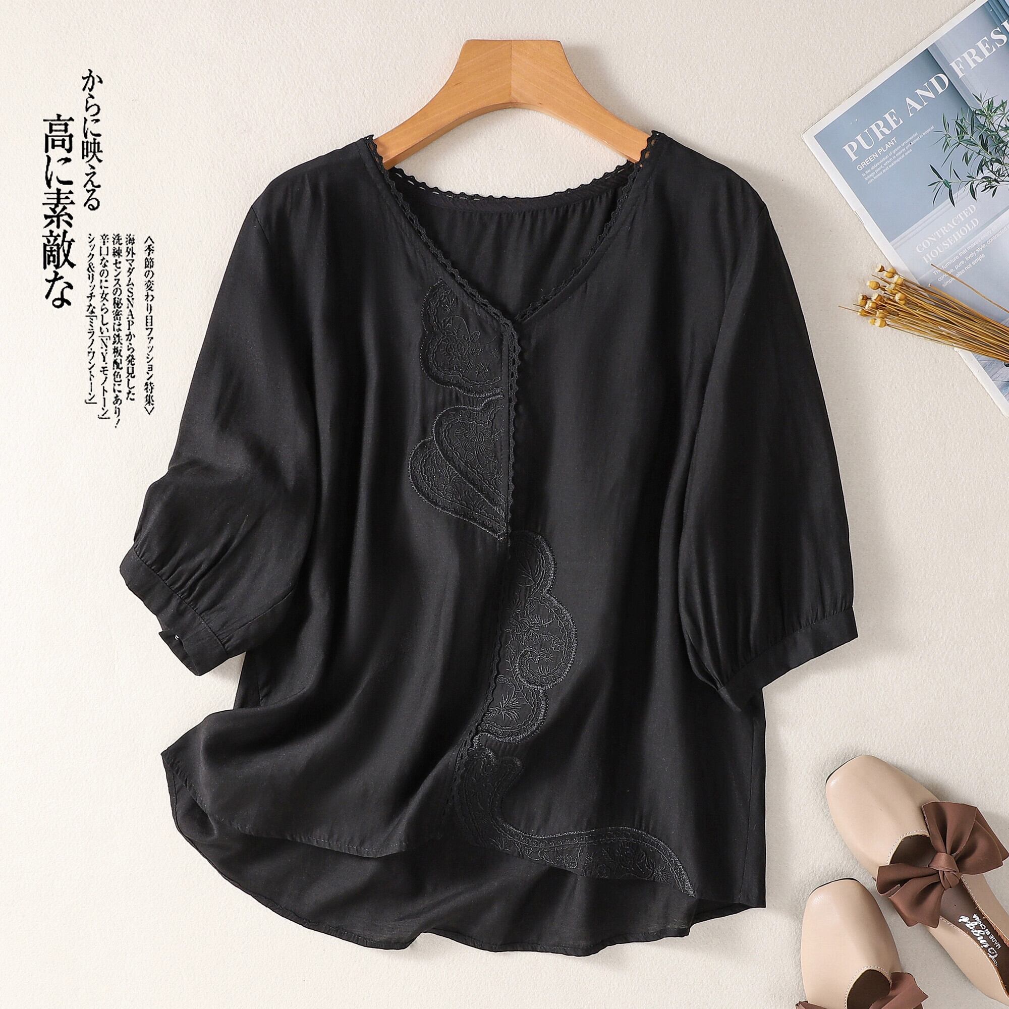 カウンタークリアランスグッズ レディース コットンリネン 刺繍シャツ トップス ルーズ Vネック リネン 七分袖シャツ レッド sine63583935406