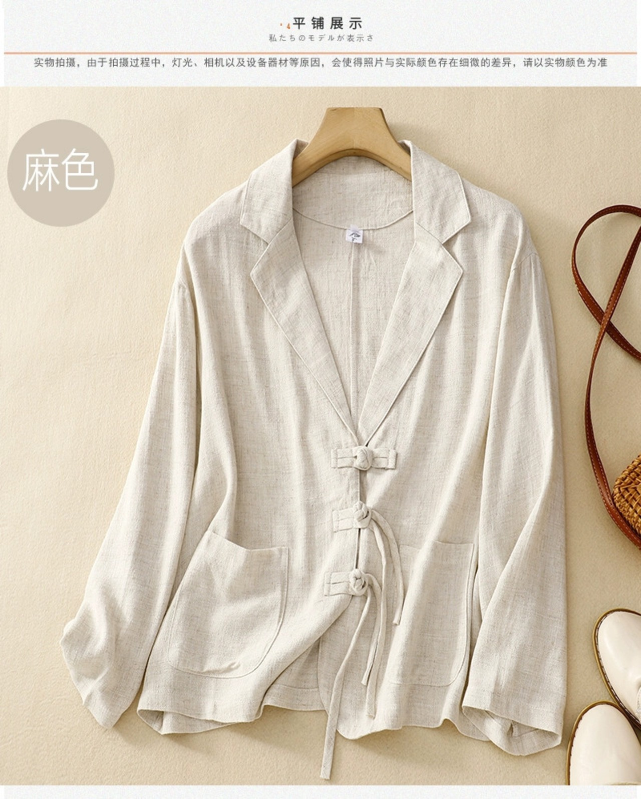 クリアランスリーク〜eseオリジナルオーダーレトロリネン長袖スモールスーツトップレディースルーズコットンとリネンスーツカラージャケット ロング sine75609265453