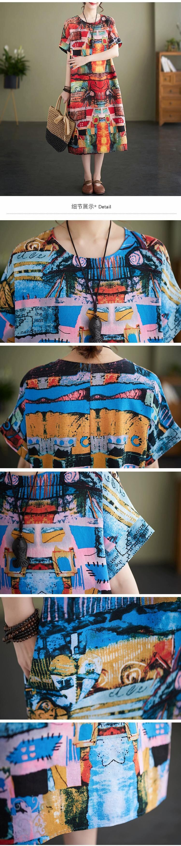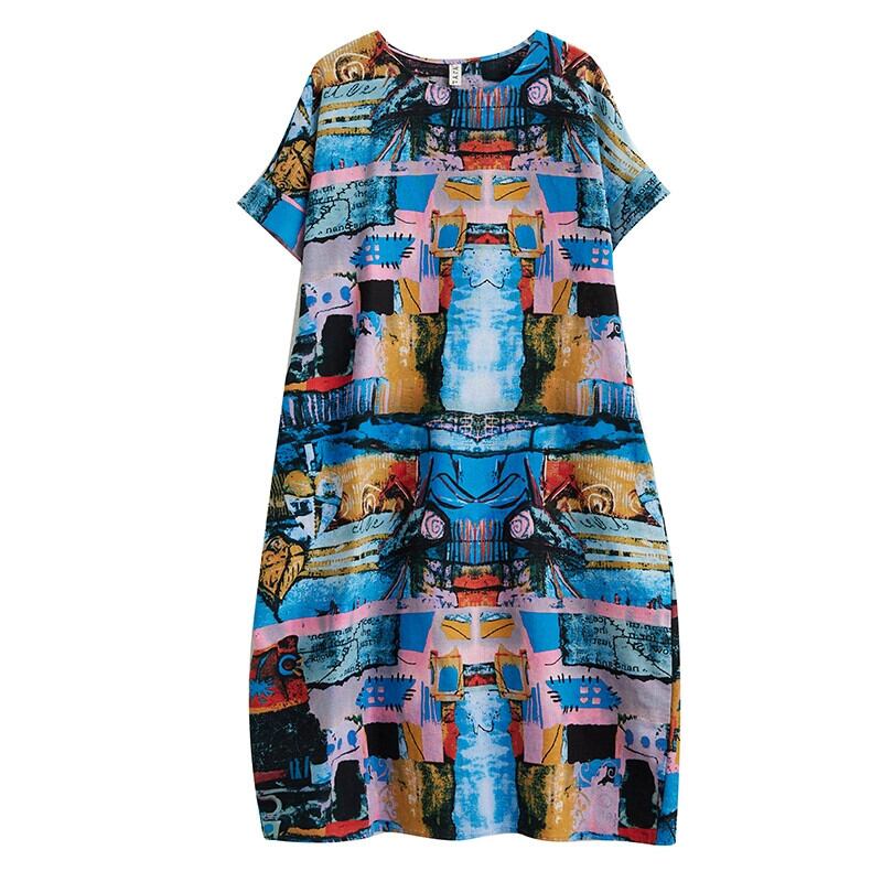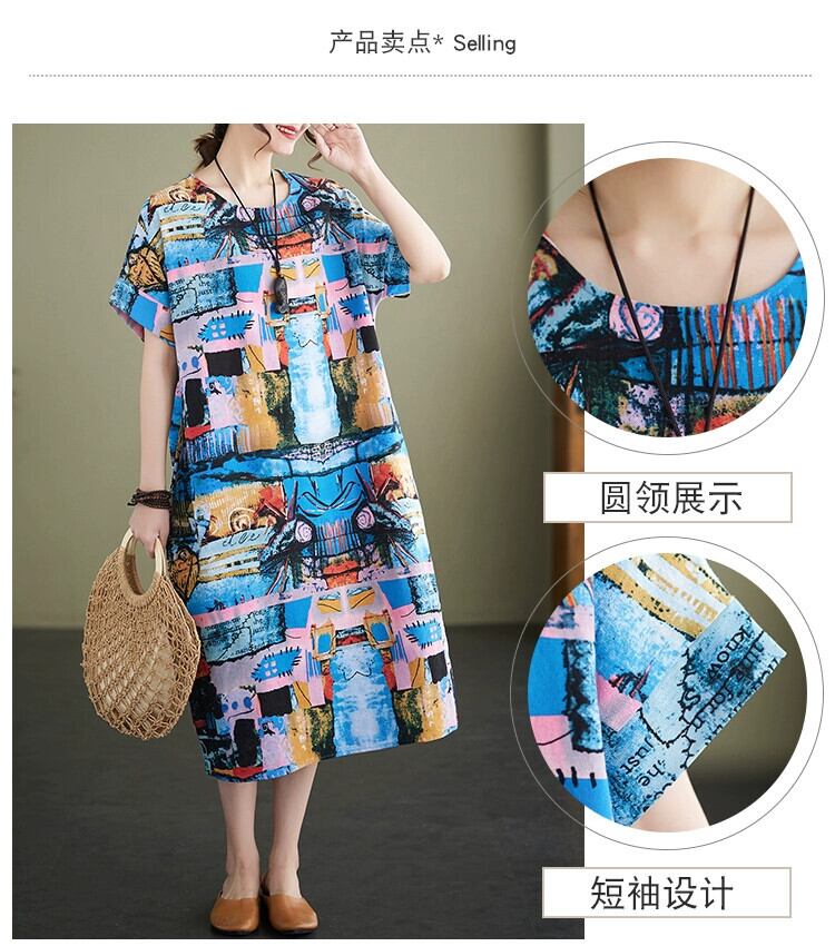クリアランスリーク〜カウンター最後の在庫レディースアーティスティックプリントリネンドレスルーズカジュアルコットンとリネン半袖Aラインロングスカート sine99447518565