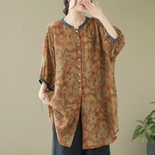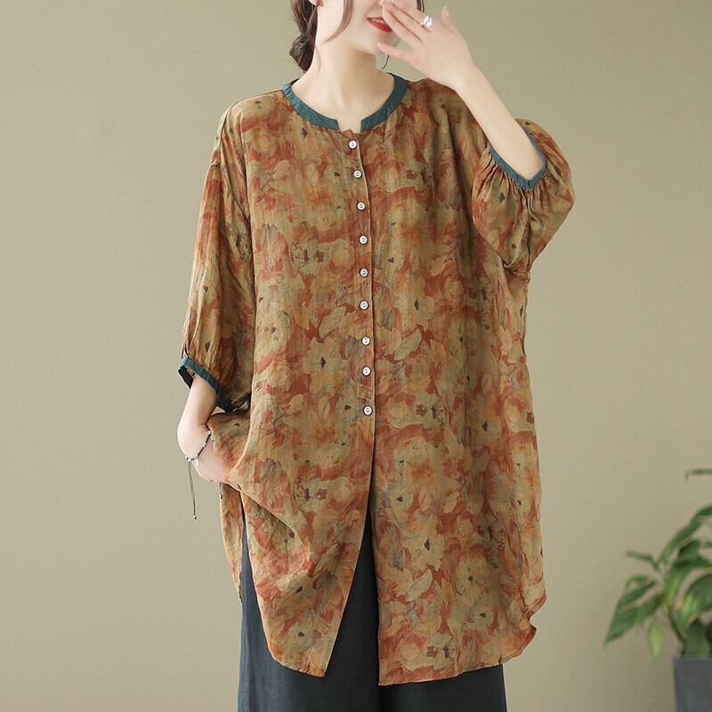 eign trade counter ブランドテールグッズ女性のレトロプリントミッドレングスコットンとリネンシャツ夏ルーズリネン日焼け止めシャツトップ サマー 夏物 sine44303538581