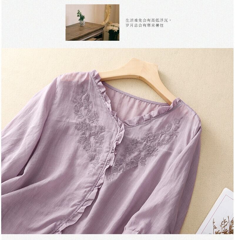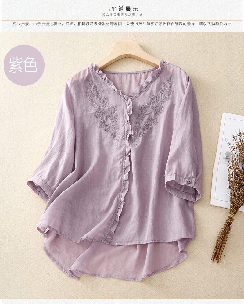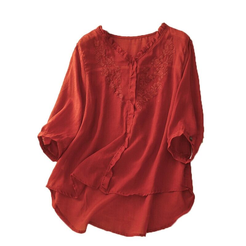 クリアランスカウンター最後の在庫レディース刺繍レースコットンとリネンシャツルーズVネックリネン七分袖トップ レッド sine45872675297