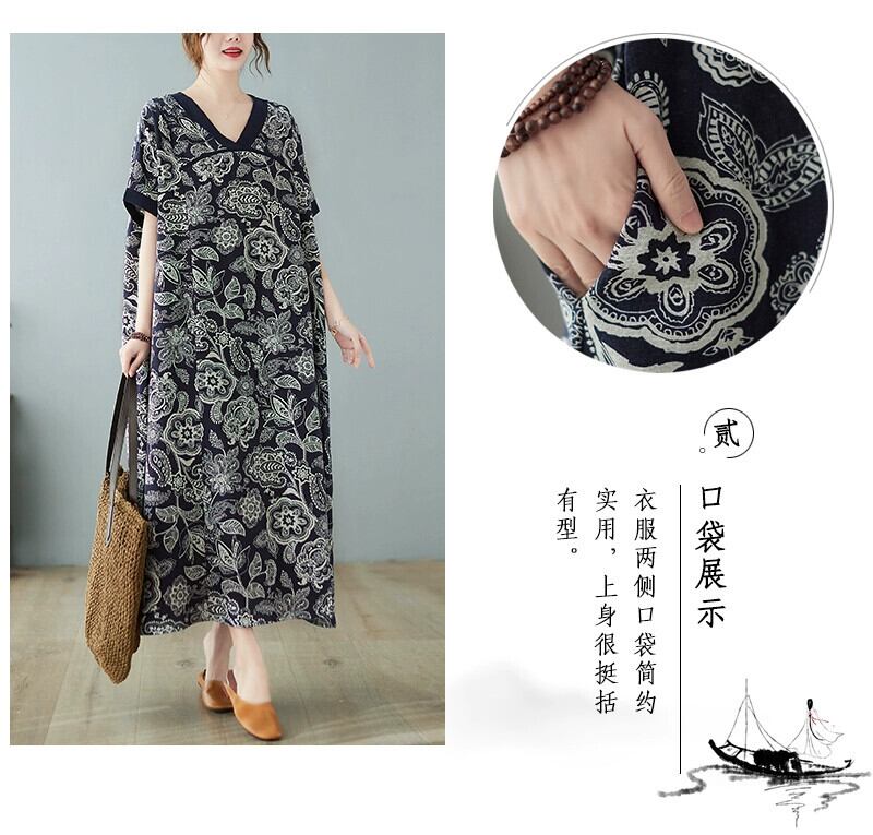 ディスカウント ストア ショッピング モール レトロなコットンとリネンの半袖ドレス、芸術的なプリントのルーズ V ネック リネン ロング スカート Vネック sine44585888440