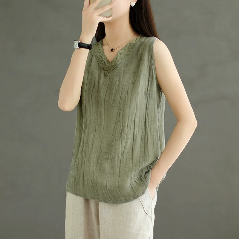 クリアランスブランド 牛グッズ カウンターエンドグッズ レトロ 綿麻 Vネック キャミソール レディース ゆったり リネン ノースリーブ トップス 薄手 コットン sine70121371082