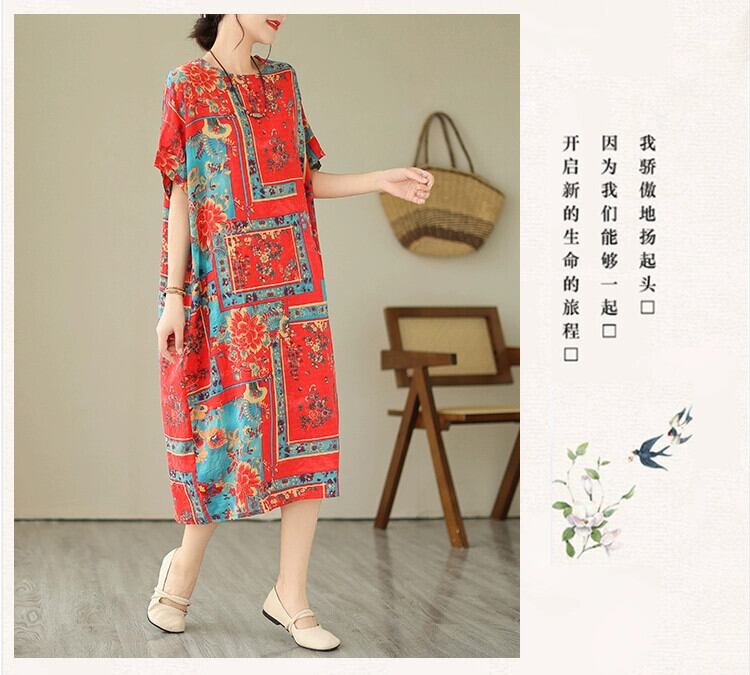 キャトルクリアランスハイエンドテールグッズエスニックスタイルプリント綿とリネンのドレス女性のゆったりとした大きいサイズのリネンミドル丈スカート コットン 大きめサイズ sine93085355490