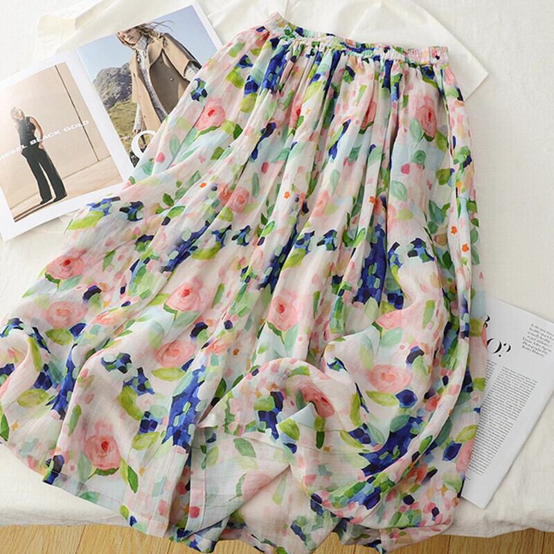 クリアランスブランド 牛グッズ カウンター端在庫 アーティスティック 花柄 ラミースカート レディース ハイウエスト ドレープ リネン Aライン ロングスカート sine57304943570
