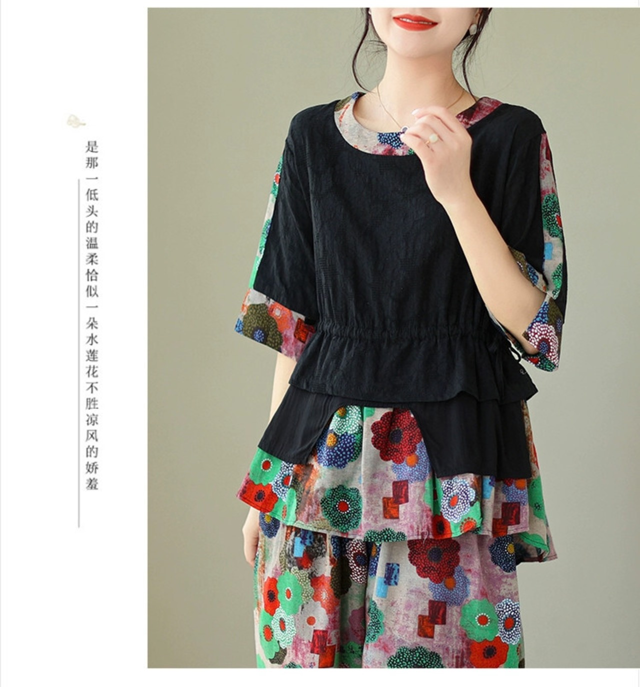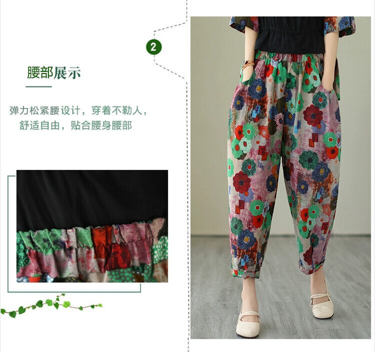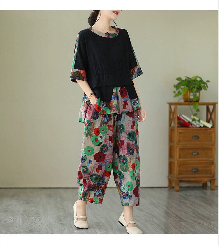 クリアランスリーク〜カウンター最終在庫レトロコットンとリネン半袖トップス夏カジュアルプリント9分パンツ2点セットレディース サマー 夏物 sine34113737312
