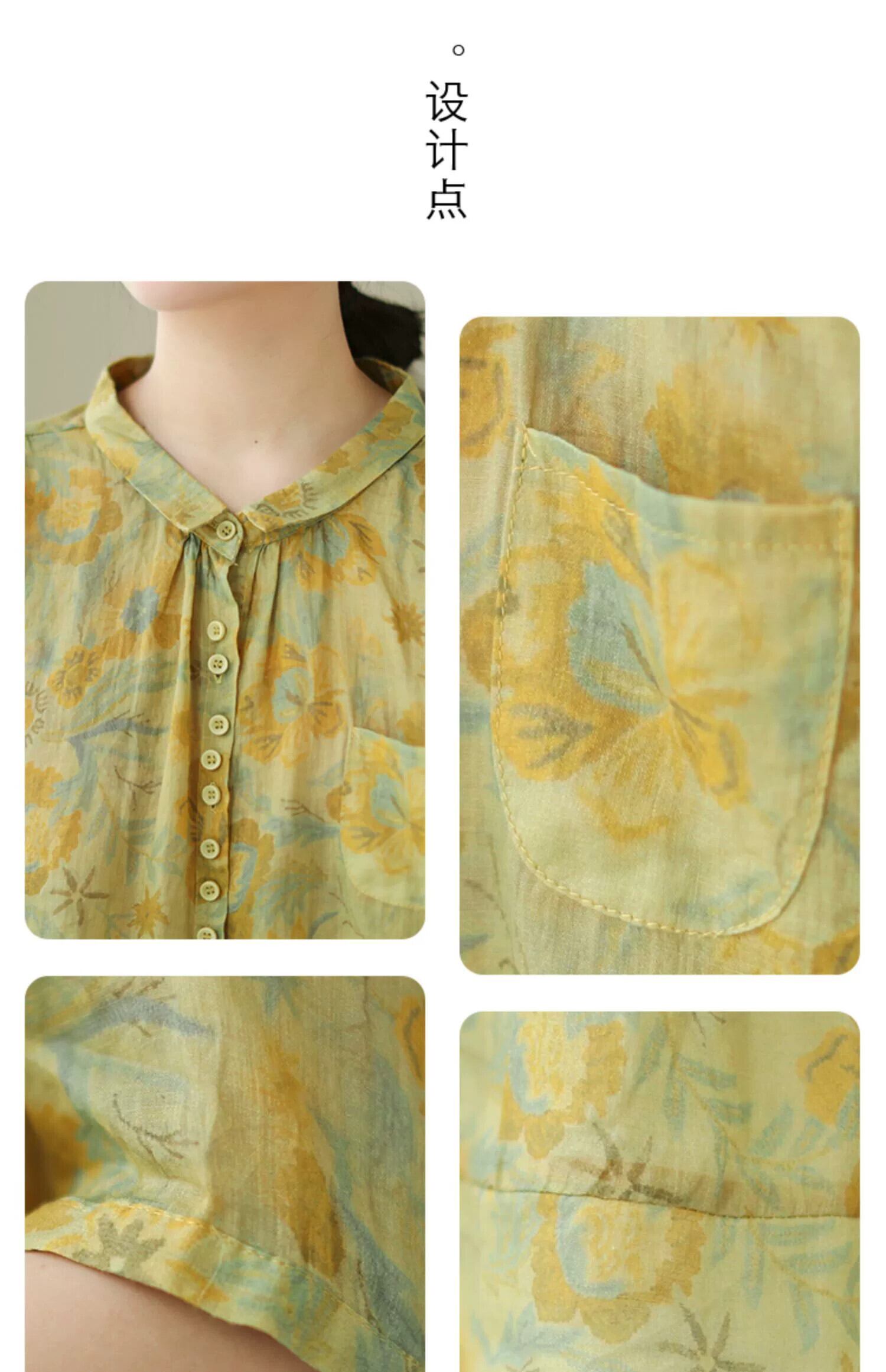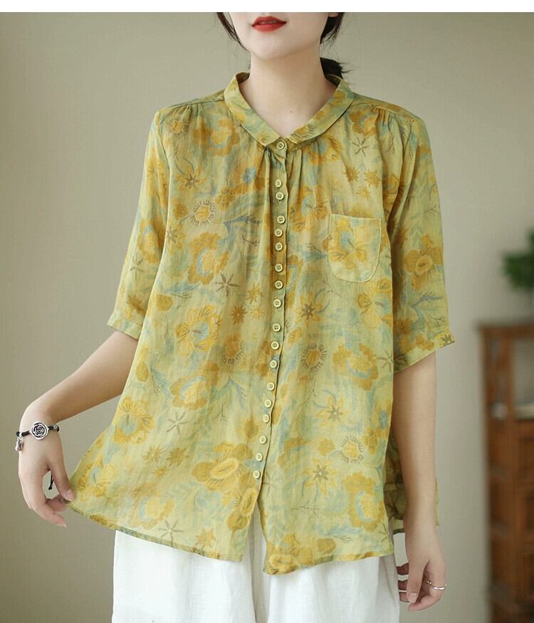 ディスカウントストア eign trade オリジナル シングルラミー 薄い花柄トップ レディース ラペル ルーズ レトロ コットン リネン 半袖シャツ sine42703208915