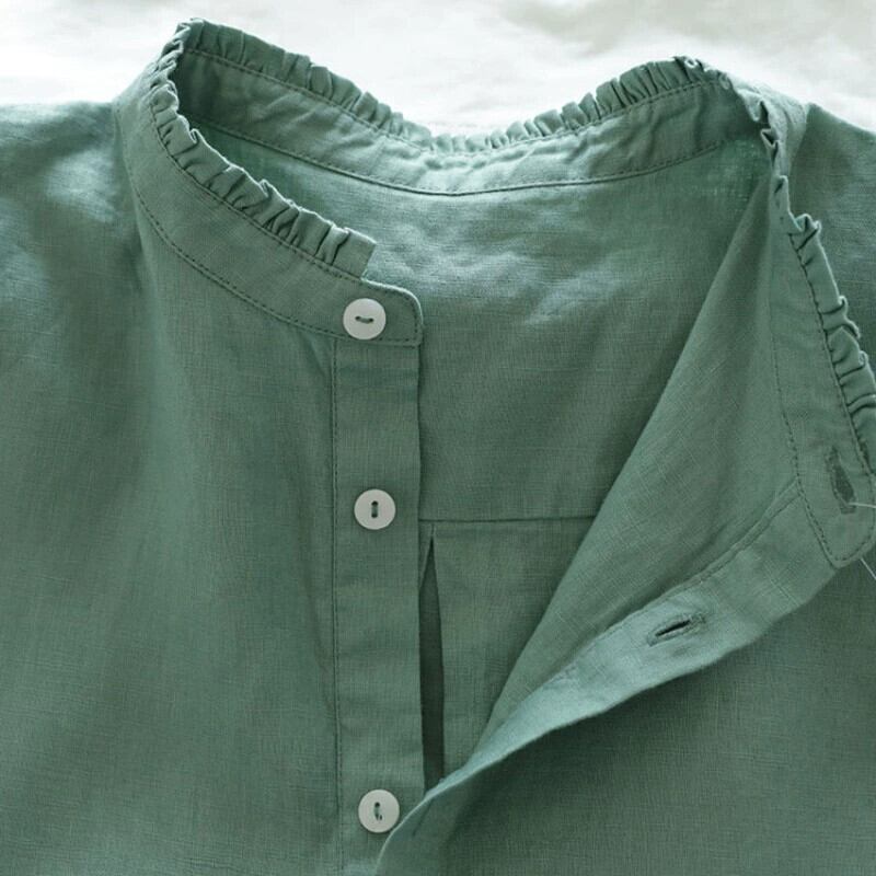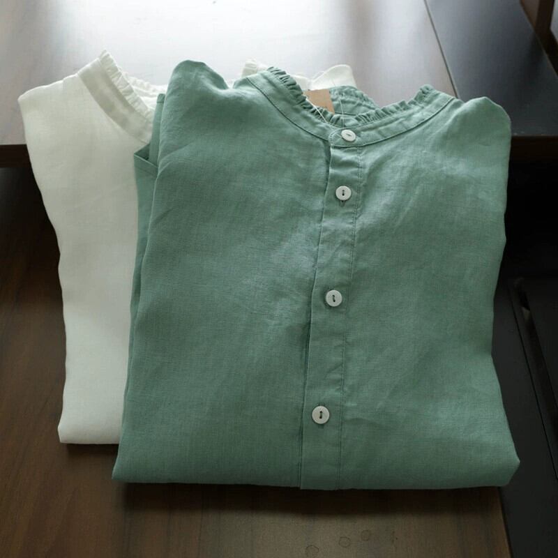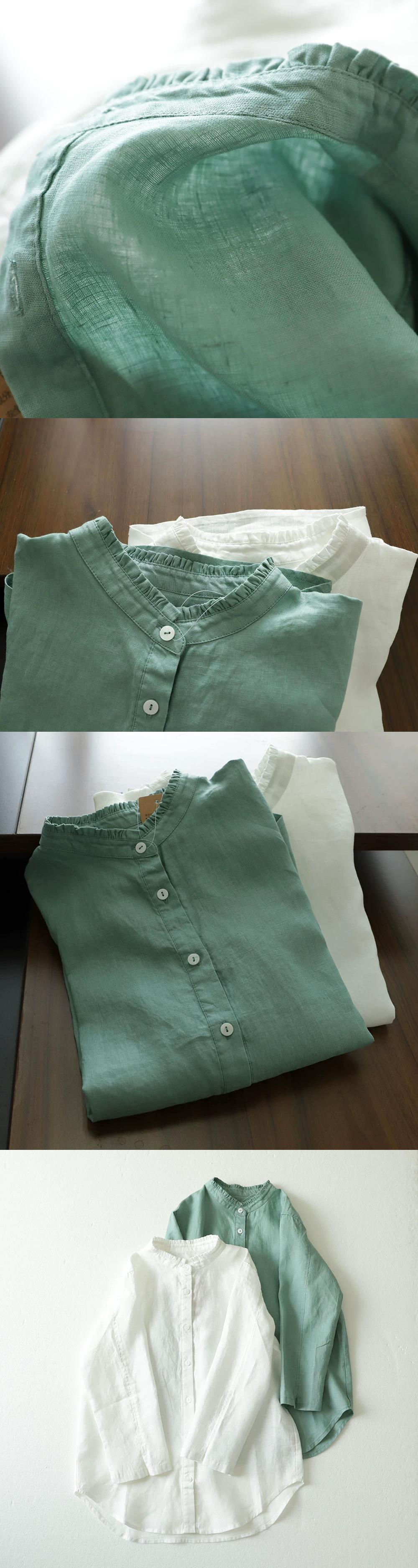 eign trade counter ブランドテールグッズ女性の無地リネン長袖シャツルーズレトロ菌レース襟綿とリネンのトップ ロング コットン ソリッドカラー sine18254881737