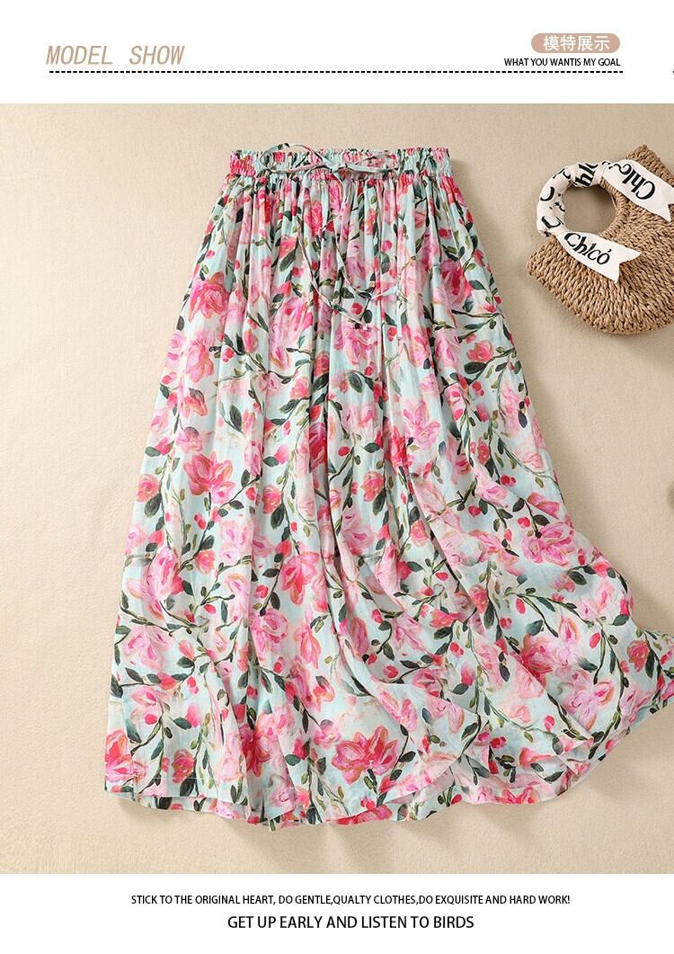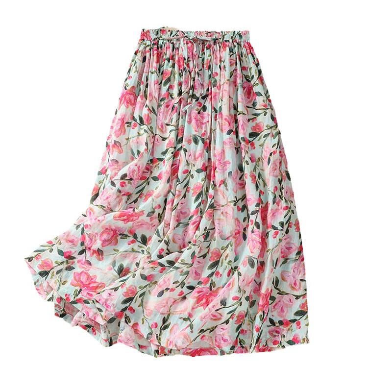 Eign Trade 割引ブランドテールグッズエレガントな花柄コットンとリネンのスカート女性の弾性ウエストカジュアルリネン A ラインスカートと大きな裾 エラスティック 伸縮 Aライン sine43639417807
