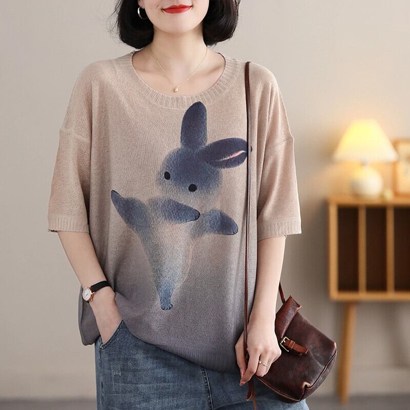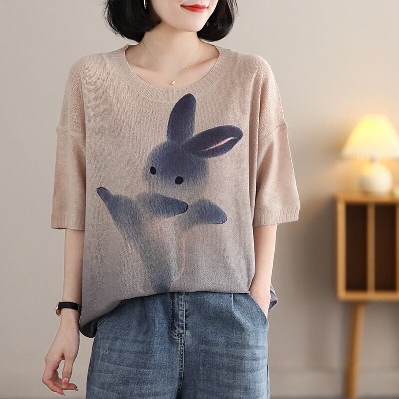 第一線ブランド eign trade 撤退ウサギプリントプルオーバーセーター女性ルーズラウンドネック半袖 Tシャツトップ Oネック sine97446628103