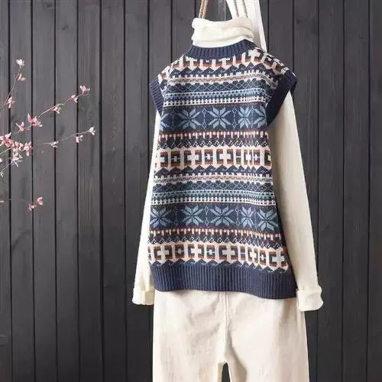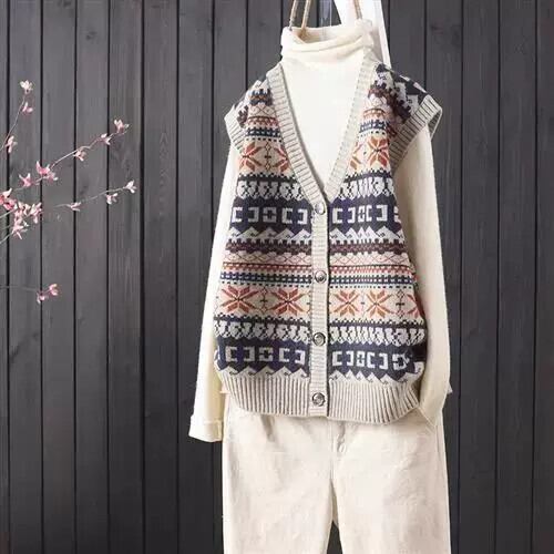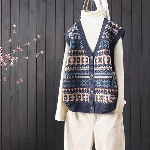 クリアランスカウンターストア最終在庫レトロプリントニットベストレディースルーズVネックノースリーブセーター sine13321855585