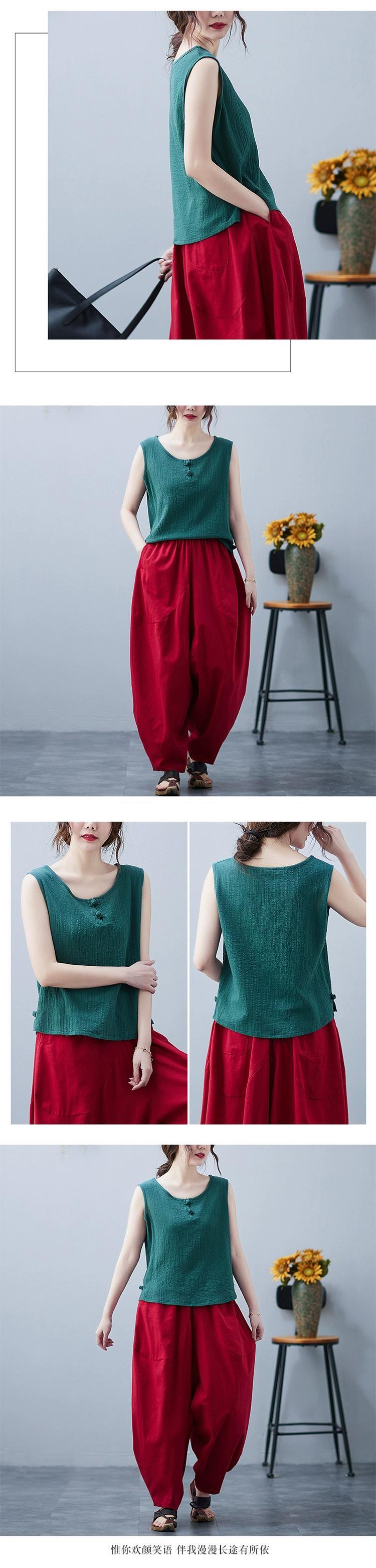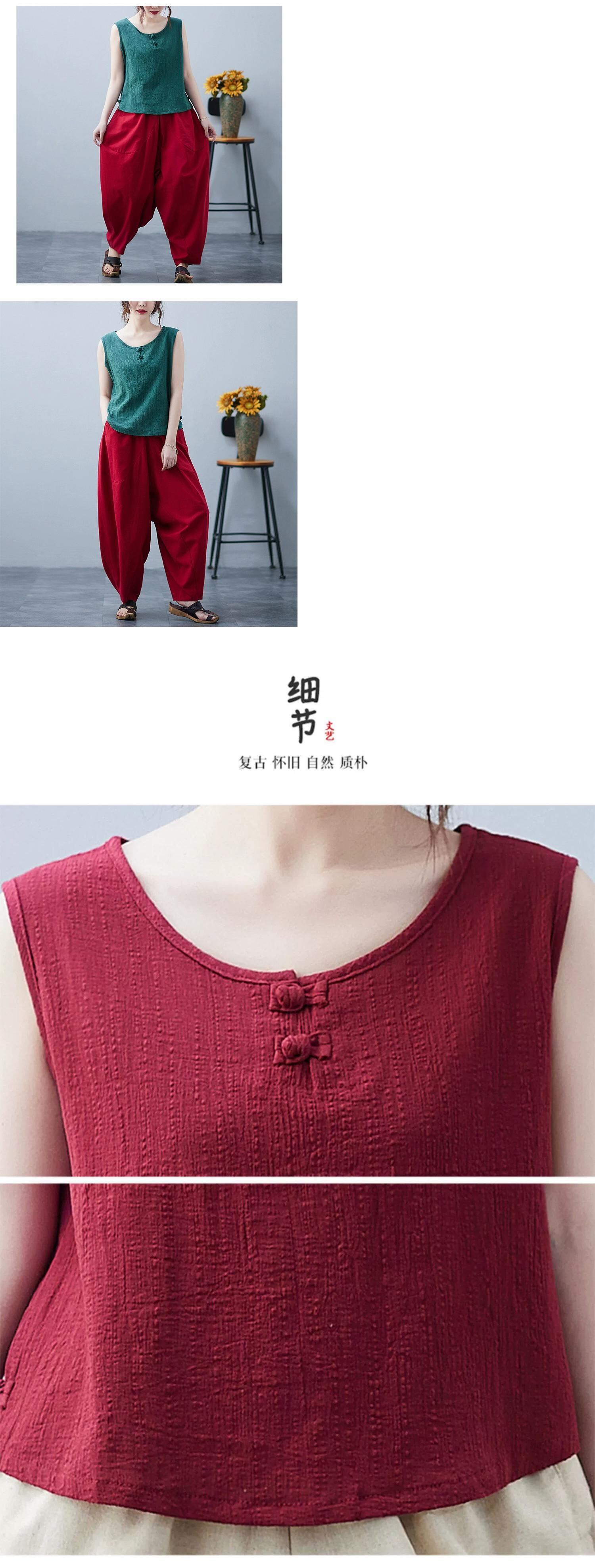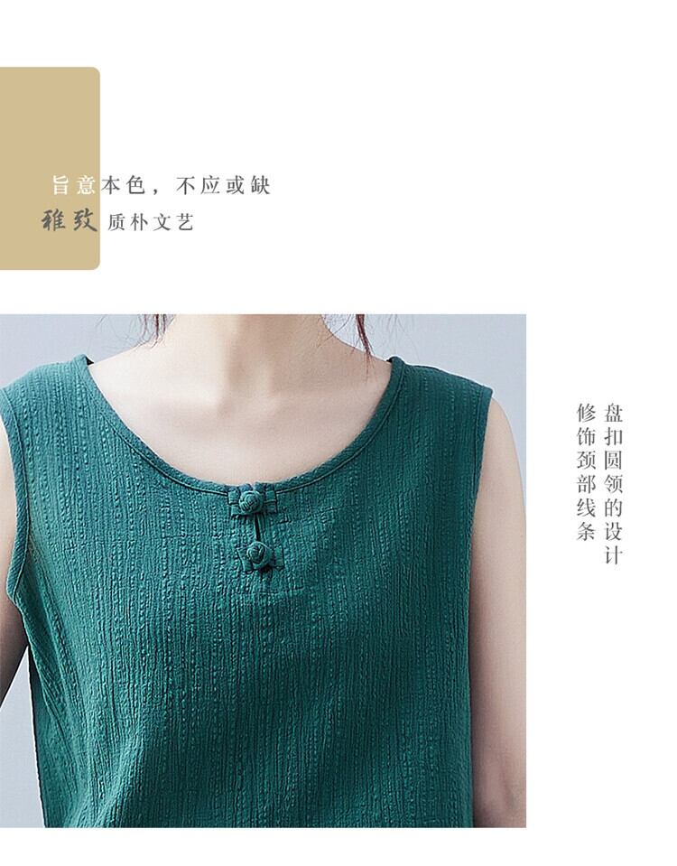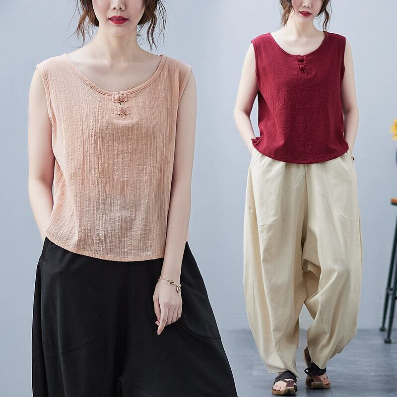 コットンとリネンの T シャツ、小さなベスト、女性の夏文学的な無地のディスク バックル、薄手のノースリーブ リネン、ゆったりとした大きいサイズのボトリング シャツ トップス 大きめサイズ サマー 夏物 Tシャツ ソリッドカラー sine30933429129