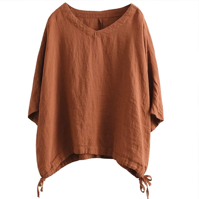 クリアランス漏れ ~ 有名商品の女性向けカウンター、レトロなバットスリーブのリネントップス、ゆったりとした V ネックのコットンとリネンの半袖 T シャツ Vネック Tシャツ sine79309646151