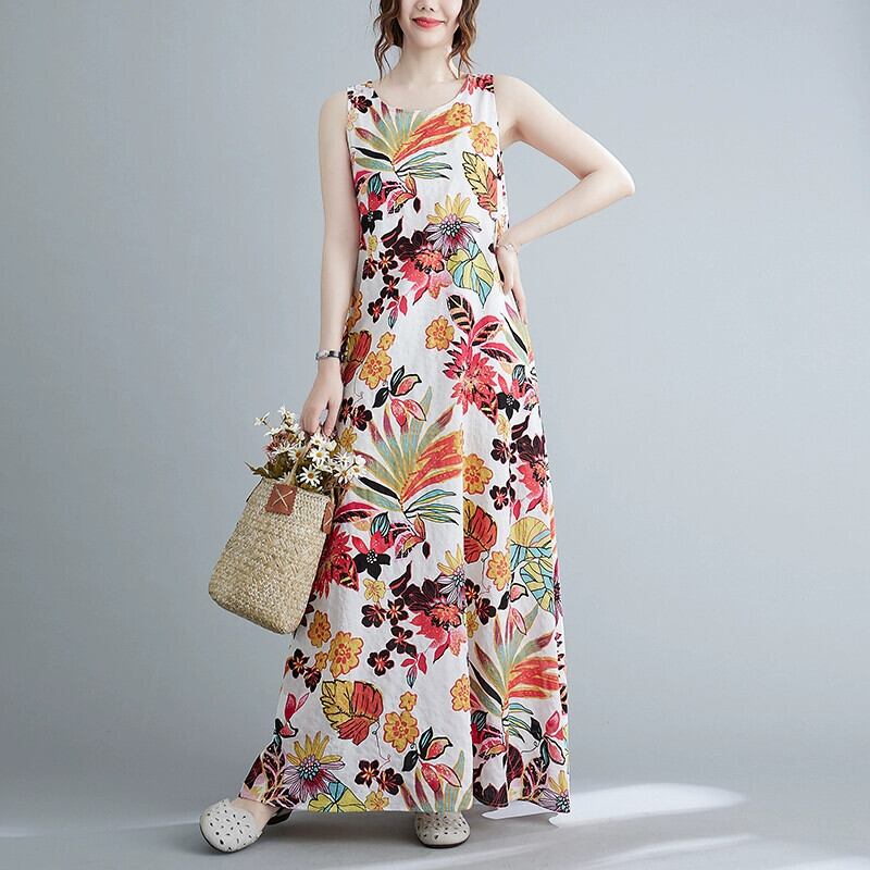 2022 夏の綿とリネンドレスルーズ大きいサイズエスニックスタイルレトロプリント通気性大スイングキャミソールローブ コットン 大きめサイズ サマー 夏物 sine5035052243