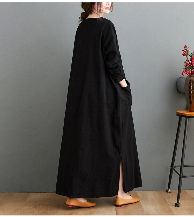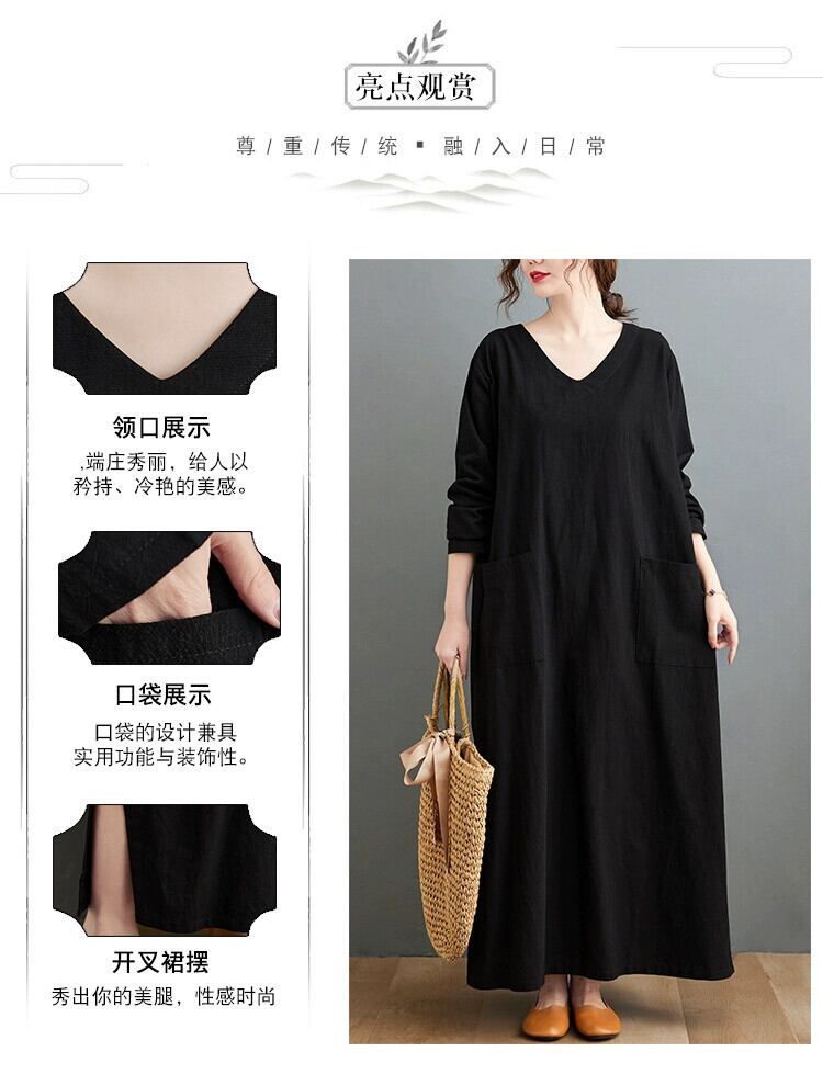 特大サイズ 220 キャティーレディース長袖ドレス、春と秋のゆったりとした年齢軽減 V ネック脂肪、肉をカバーする綿と麻のロングローブ コットン 大きめサイズ スプリング 春物 オータム 秋物 Vネック sine65773909044