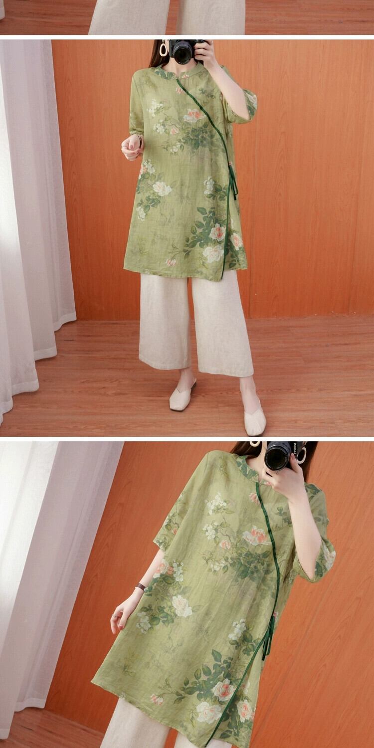 コットンとリネンのドレス、プラスサイズのレディース スタイル、ルーズ、アーティスティック、斜めのラペル、チャイナ スタイルのトップ、レトロなリネンのミドル丈スカート、夏 大きめサイズ サマー 夏物 sine59951209260