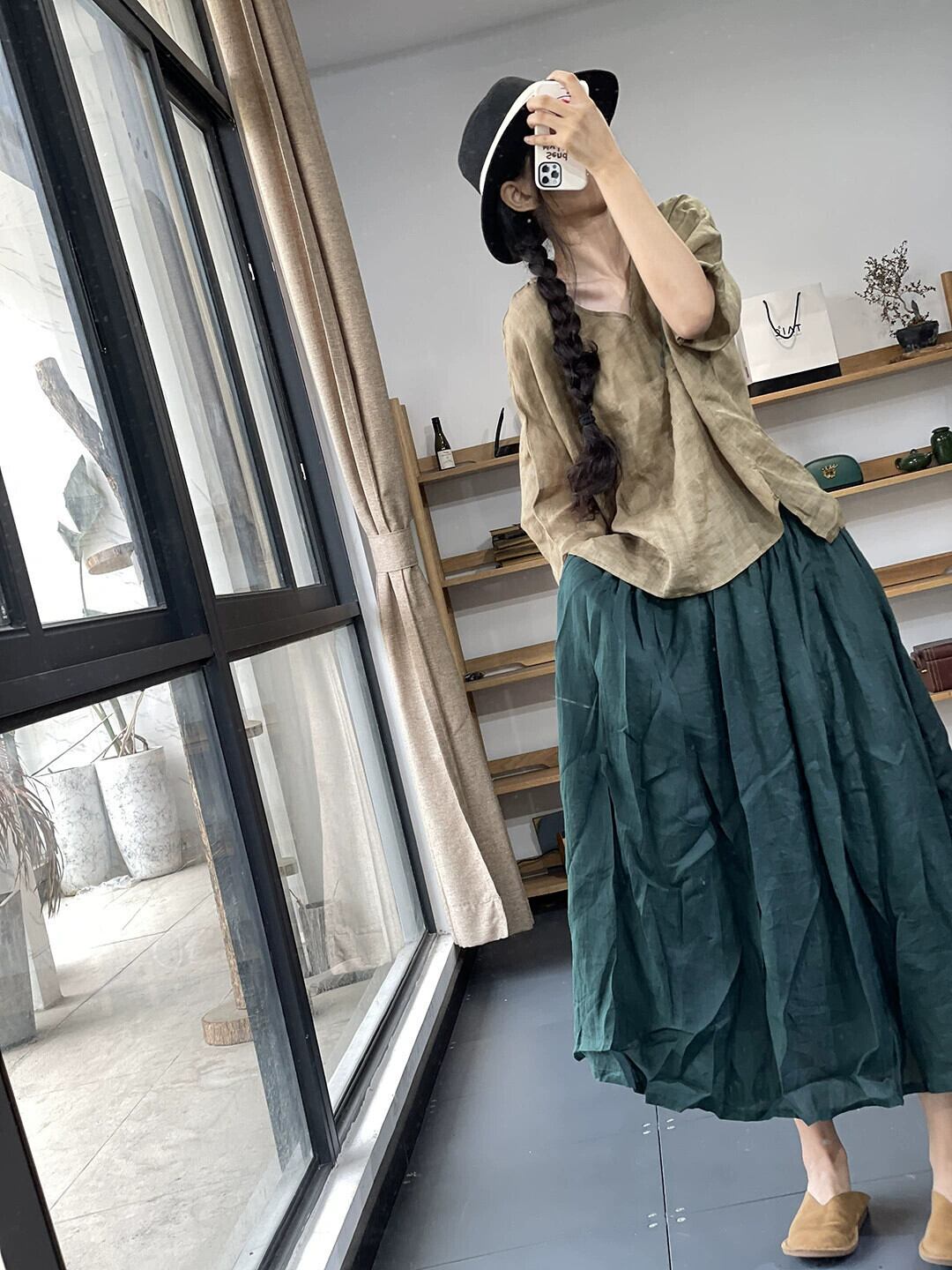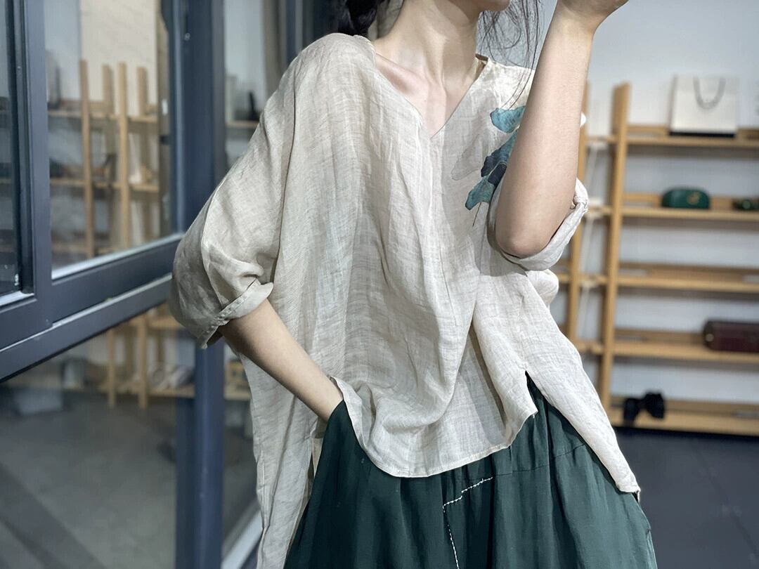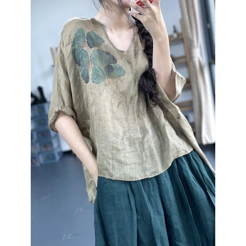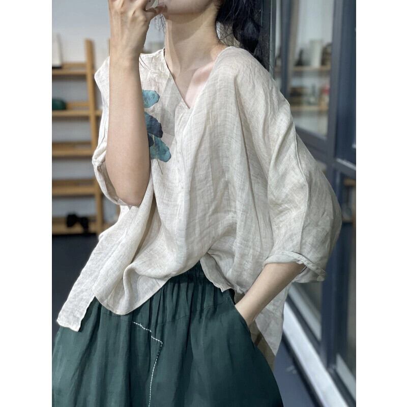 クリアランスリーク〜eseオリジナルレトロプリントラミーVネックトップTシャツレディースルーズ七分袖綿麻シャツ コットン sine57546991001
