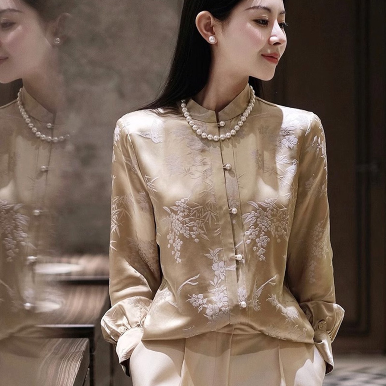 第一線のブランド eign trade 撤退最後の在庫新しい中国風国民風ジャカード重工業ビーズアセテートサテンスタンドカラーシャツ女性 sine98966070746