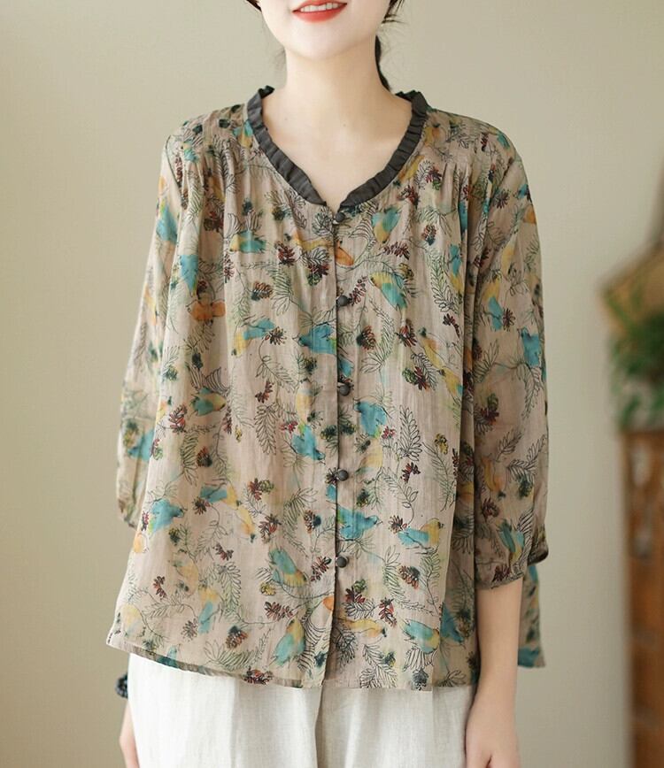 リークをピックアップ〜カウンターは有名ブランド、レディースレトロ花柄七分袖トップス、大きいサイズのVネックレース綿麻半袖シャツ コットン 大きめサイズ sine37541555996