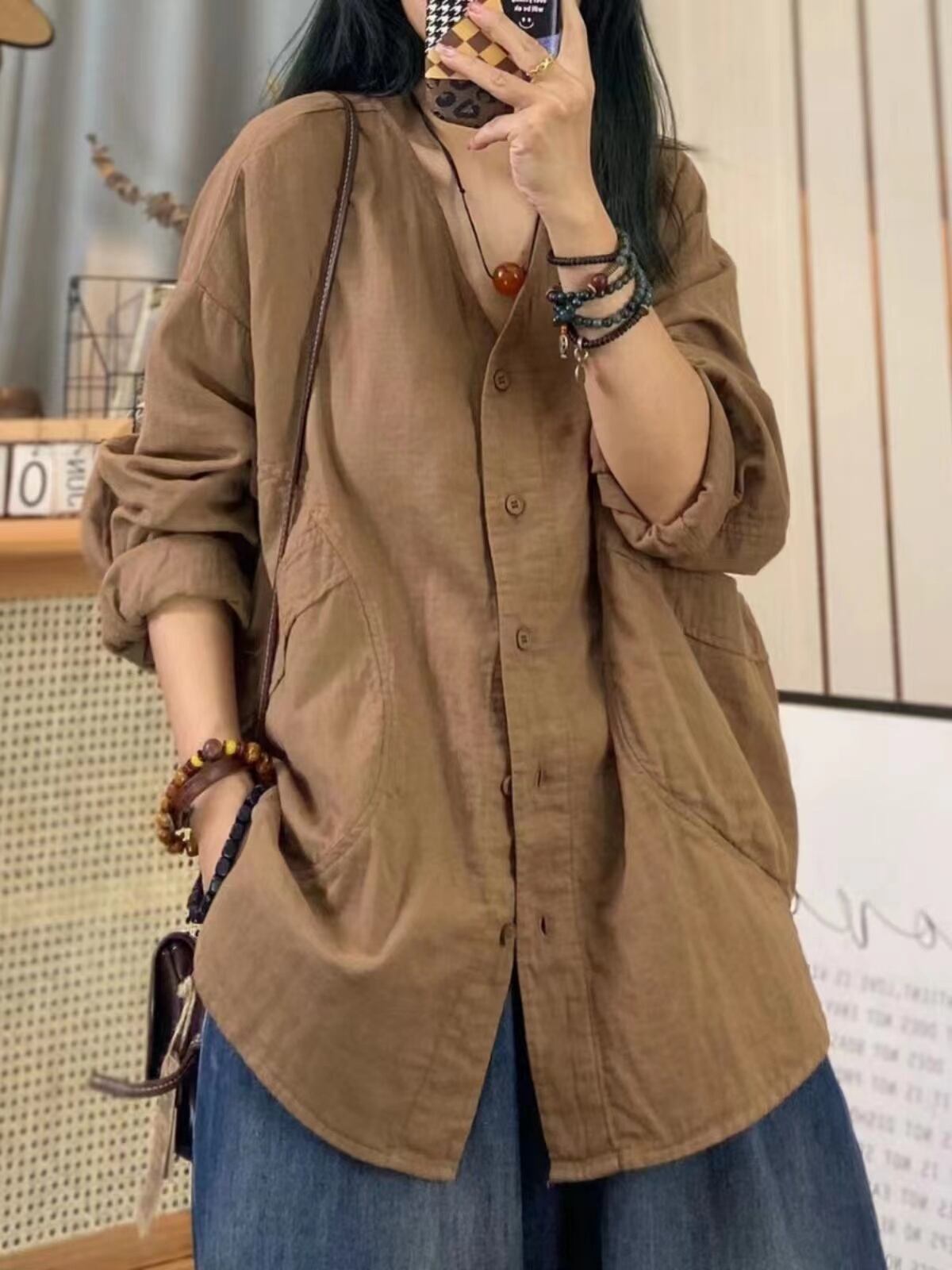 Eign Trade 輸出ブランドテールグッズレトロ二重層コットンとリネンシャツレディースルーズ大きいサイズ V ネックカーディガン長袖トップ秋 ロング 大きめサイズ オータム 秋物 Vネック sine92103995593