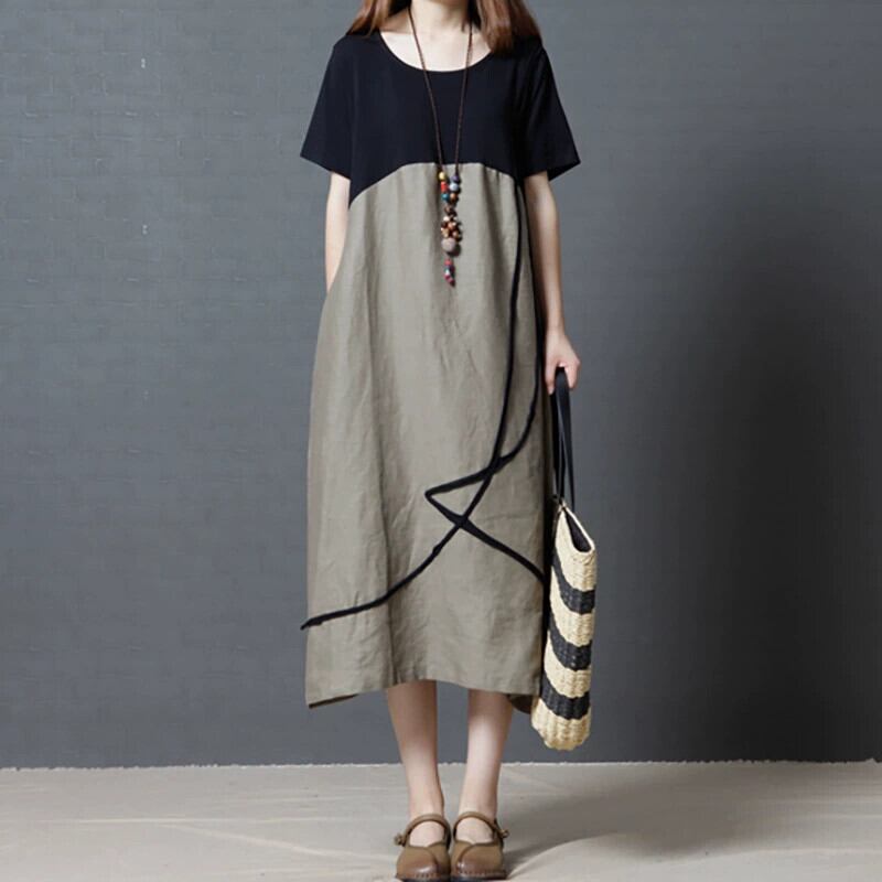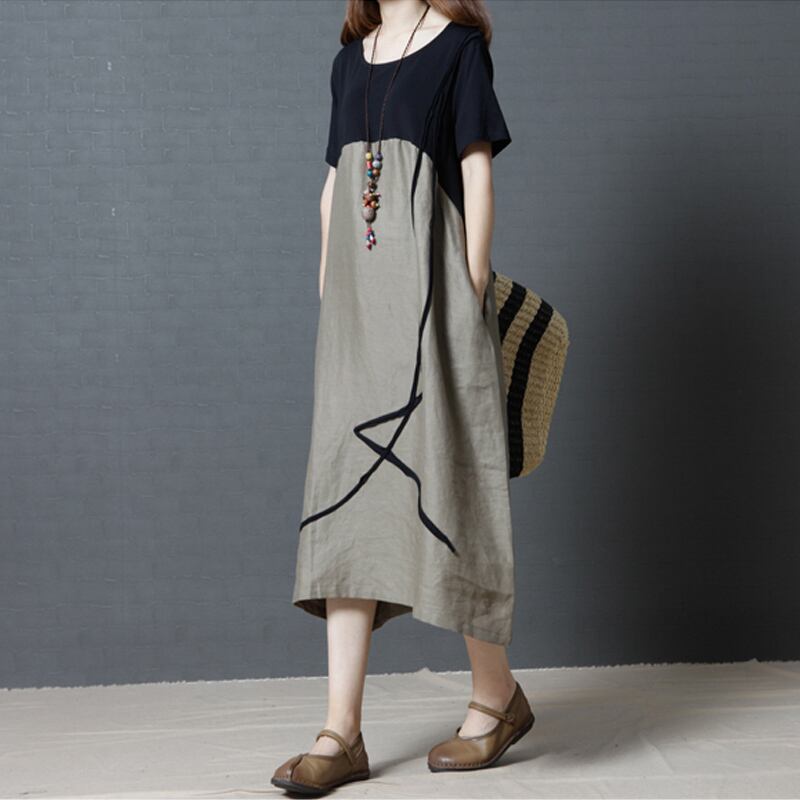 コットンとリネンのドレス夏 2020 新しい緩い大きいサイズスプライシング脂肪 mm 痩身スタイル半袖リネンミドル丈スカート 大きめサイズ サマー 夏物 sine56604858723