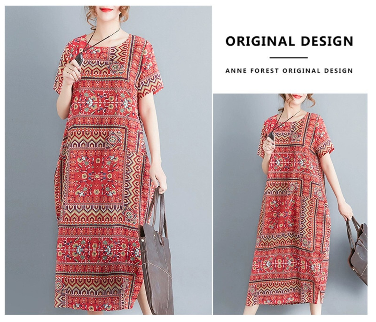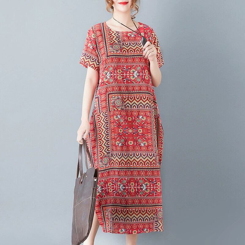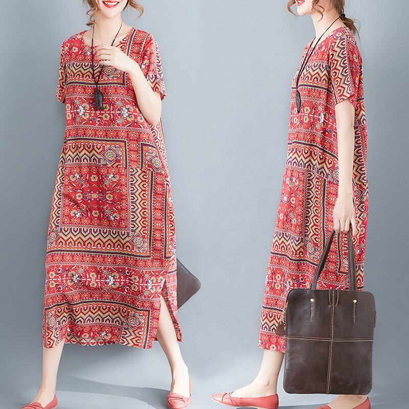 コットンとリネンのドレスプラスサイズの女性の 2018 夏の新しいエスニックスタイル半袖スリット脂肪 M ルーズリネン A タイプミドル丈スカート 大きめサイズ サマー 夏物 sine82170192597