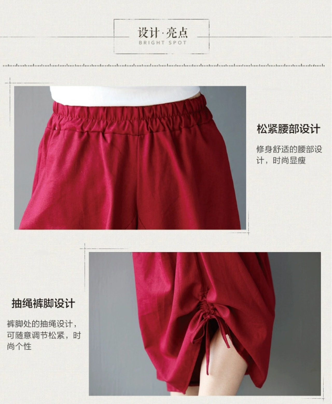 2021 夏綿とリネンブルマワイドレッグクロップドパンツエスニックスタイル無地弾性ウエストルーズ大きいサイズドロップクロッチパンツ コットン エラスティック 伸縮 大きめサイズ サマー 夏物 ショーツ ブルマー ワイドパンツ ソリッドカラー sine32791334637