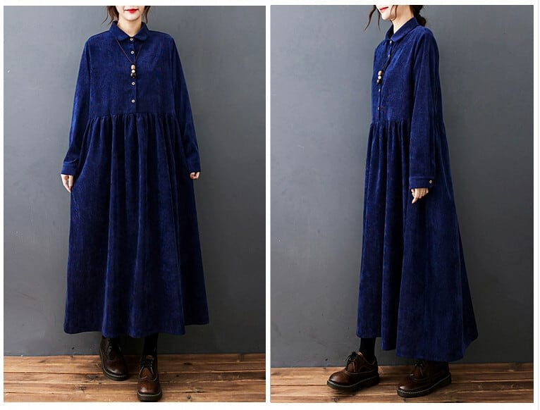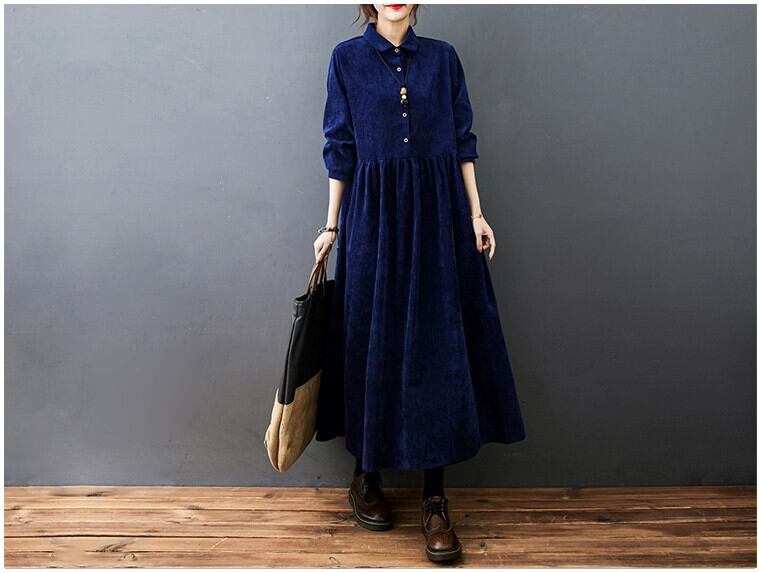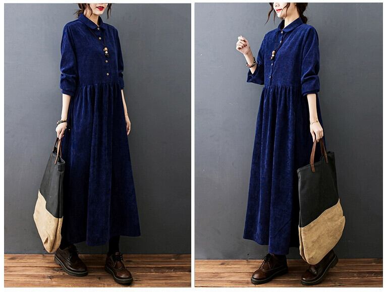 コーデュロイドレスの女性の春と秋の 2021 新作ルーズ大きいサイズファッショナブルなラペル膝高コーデュロイ長袖ミドル丈スカート ロング 大きめサイズ スプリング 春物 オータム 秋物 sine86017251694