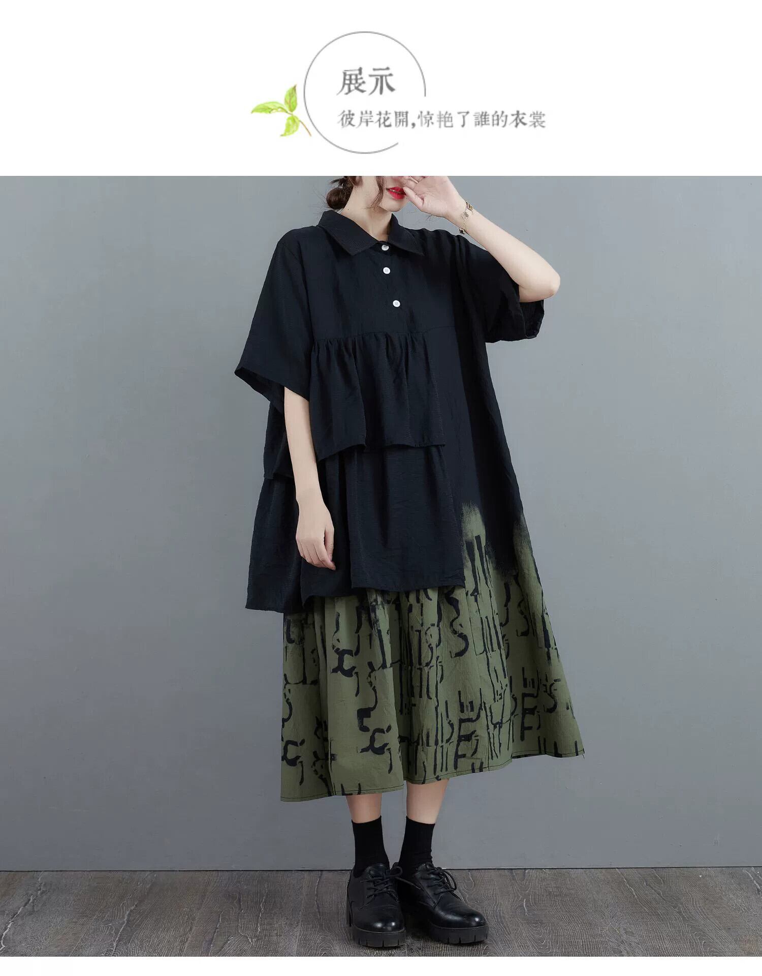 フェイクツーピースシャツドレスプラスサイズの女性のゆったりとした夏とスタイルのスプライシングプリントコントラストカラースリミング半袖ミッドレングススカート 大きめサイズ サマー 夏物 sine65742303059