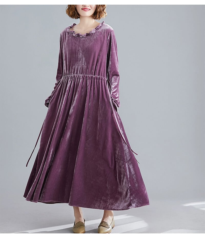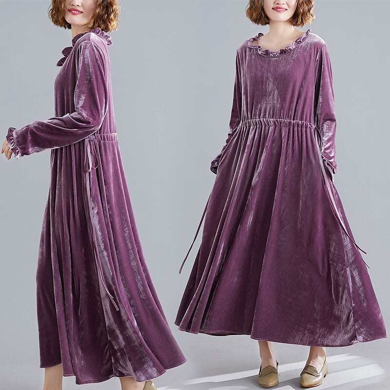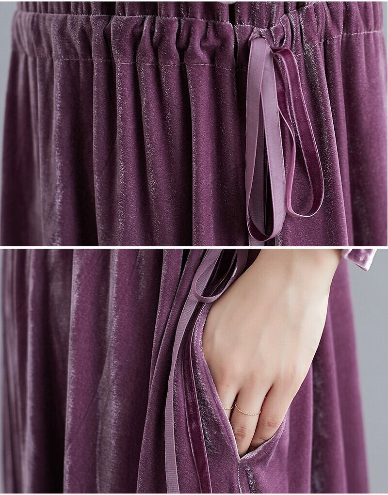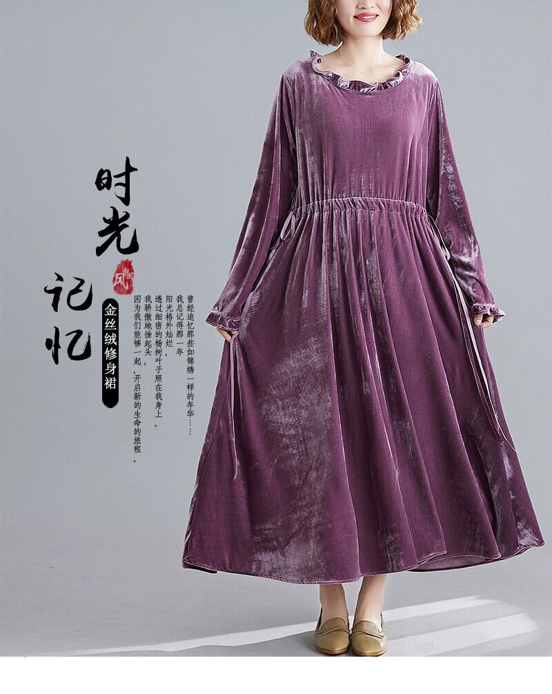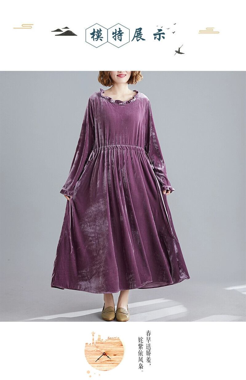 レトロなプラスサイズの女性のベルベットのドレス春と秋の新しい緩いスプライシング腹をカバーする大きな裾紫色の長袖ミドル丈スカート ロング 大きめサイズ スプリング 春物 オータム 秋物 パープル sine44169897097
