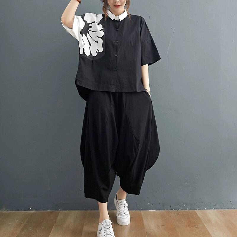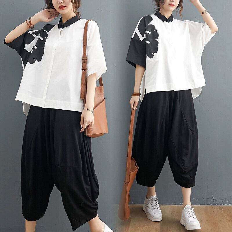 コットンとリネンの 2 点セットの女性、グラフィティ半袖シャツ、T シャツ、カジュアルなワイドレッグ スラックス、ゆったりとしたリネン スーツ、プラスサイズの婦人服 大きめサイズ Tシャツ sine58698441809