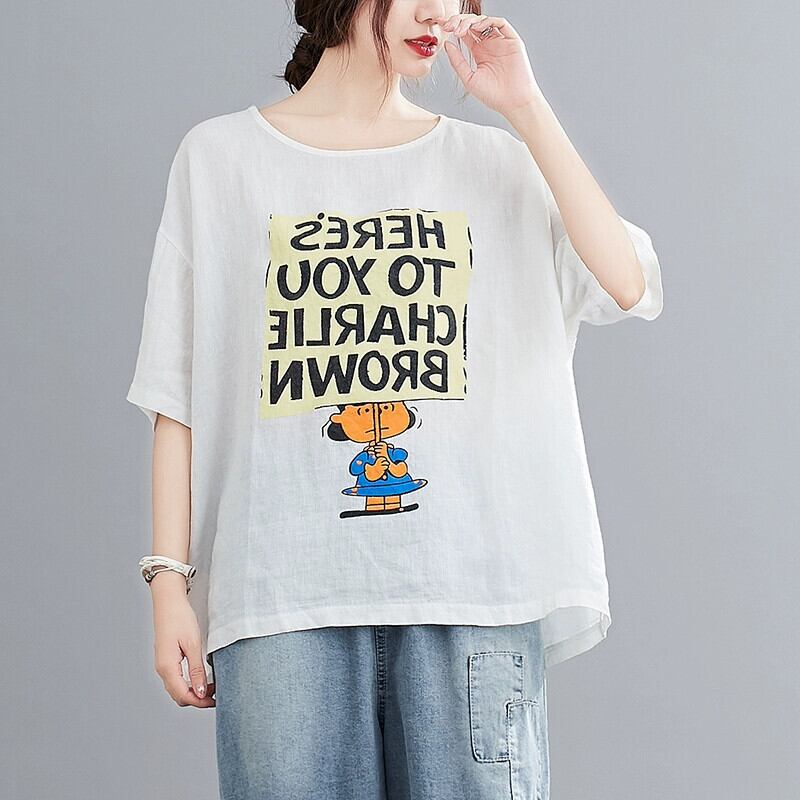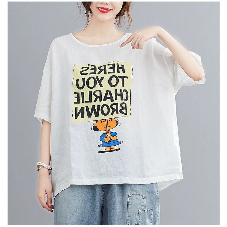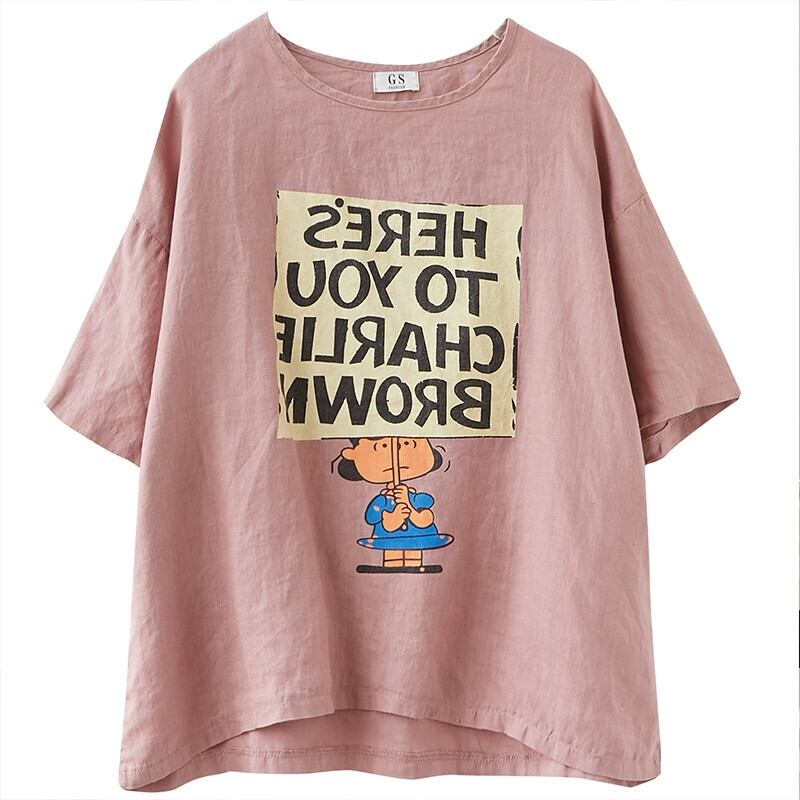 文学的なプラスサイズの女性の綿と麻の半袖 T シャツ Xia Xin のルーズなレタープリントが肉をカバーし、スリムなカジュアルなボトムトップス コットン 大きめサイズ Tシャツ sine59590361928
