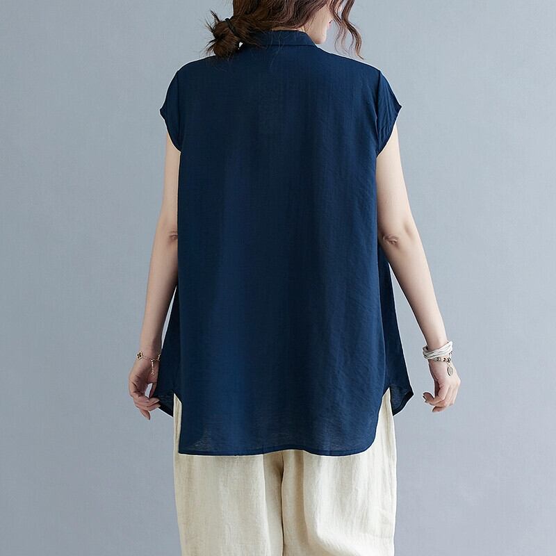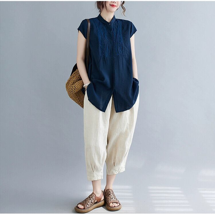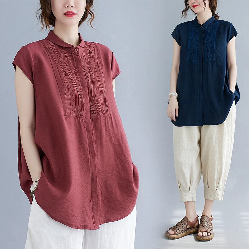 2021 夏の綿とリネンシャツルーズ脂肪ミリメートル文学刺繍スタンドカラー痩身半袖トップス大きいサイズの女性の ショート コットン ハーフスリーブ 大きめサイズ サマー 夏物 sine63584387134