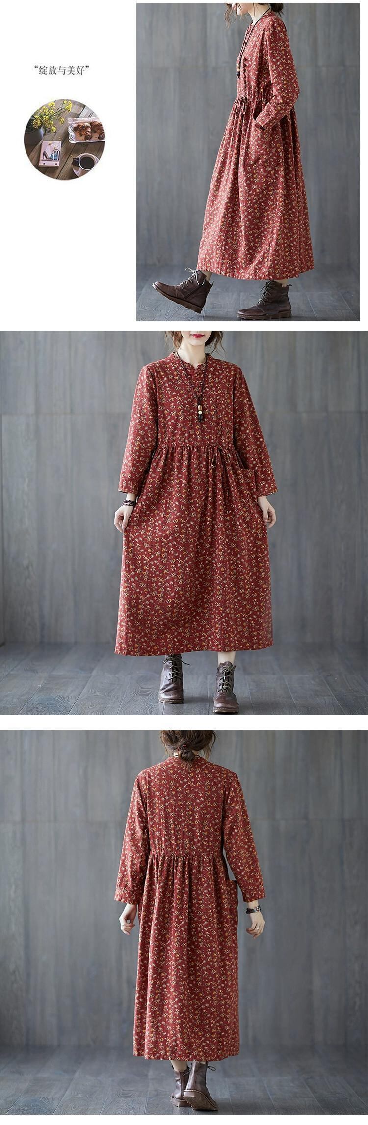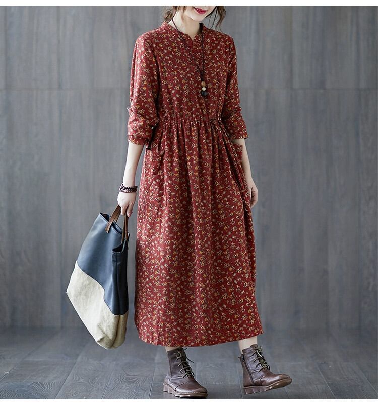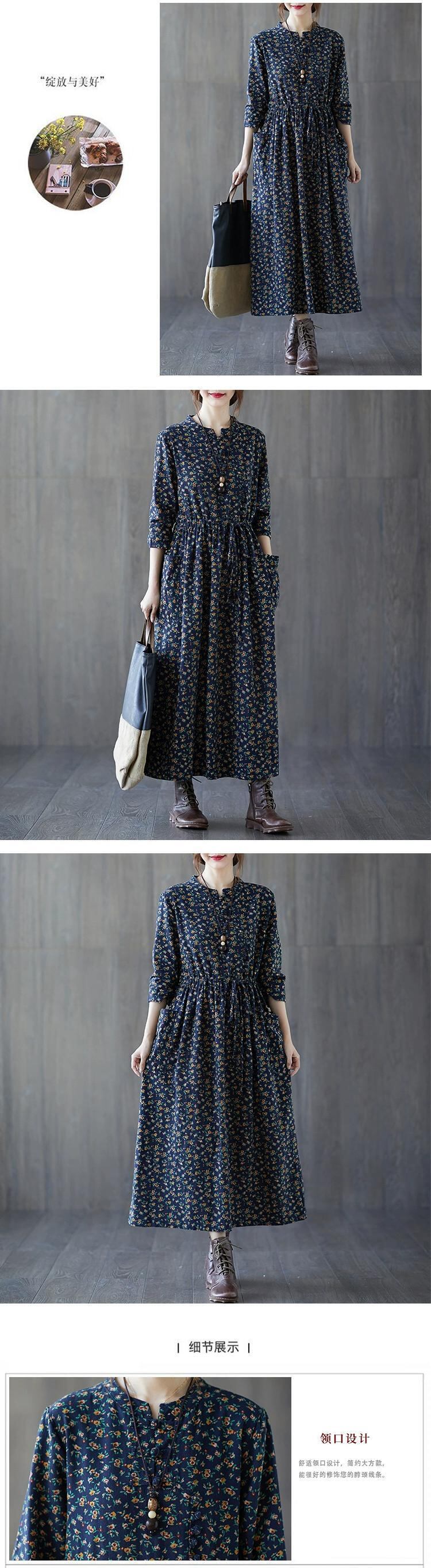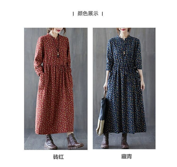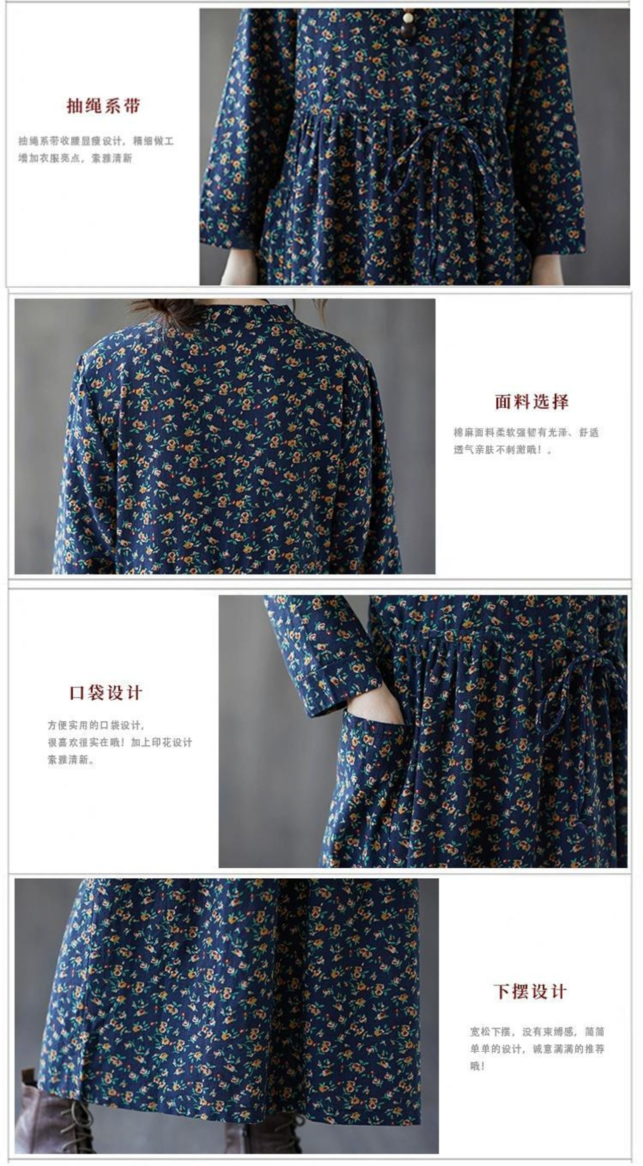 文学レトロな女性の綿とリネンのドレス春と秋のルーズ花柄シャツウエストカバーお腹長袖ミドル丈スカート ロング コットン スプリング 春物 オータム 秋物 sine81249533701