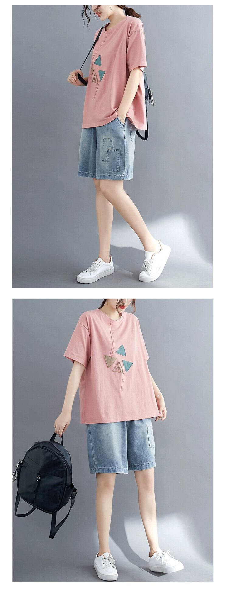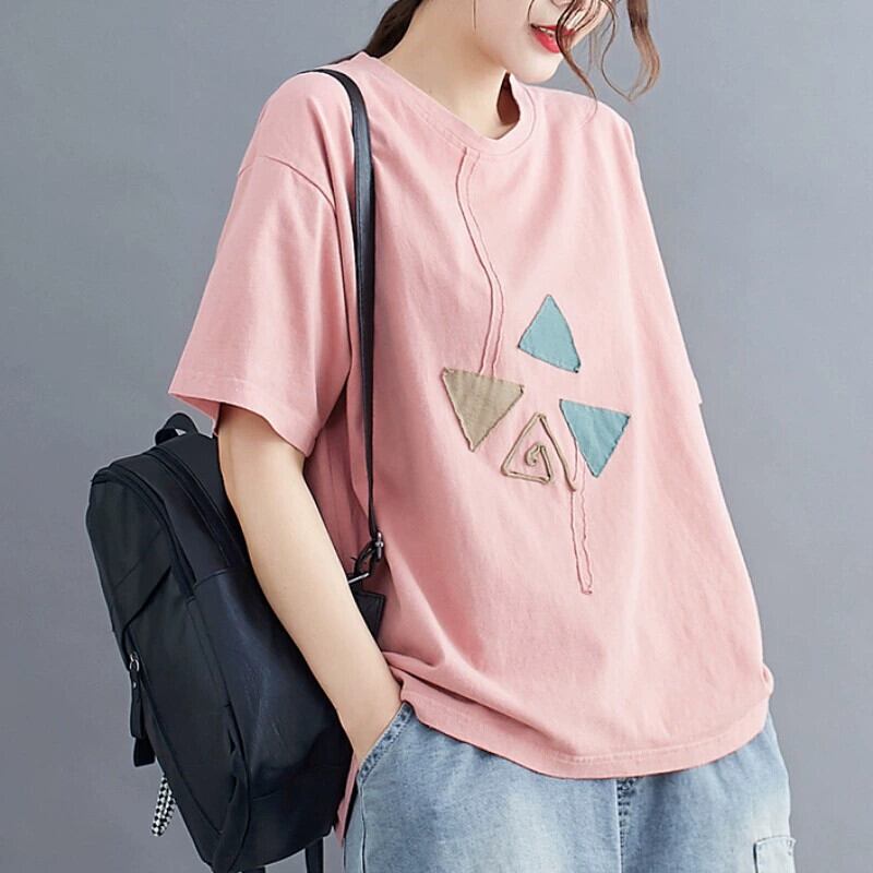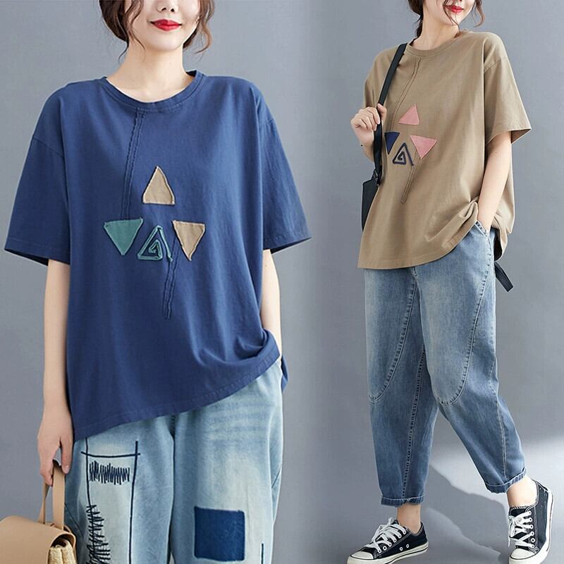 文学プラスサイズの婦人服 200 ポンド半袖 T シャツルーズファット mm パッチ対照的な色隠し肉痩身夏新カジュアルトップ 大きめサイズ Tシャツ sine52868243392