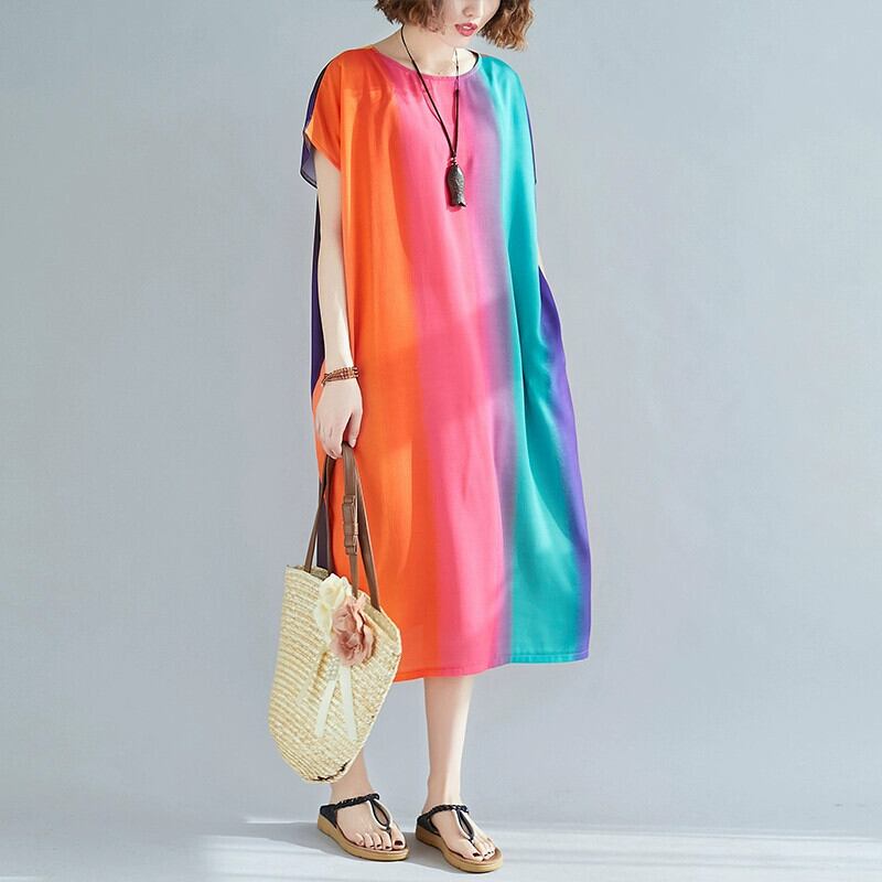 特大サイズ 200 ポンドの女性用プリント染色ドレス 夏用 ゆったりとした老化防止レインボー ストリップ コントラストのあるお腹をカバーするカジュアルなミドル丈スカート 大きめサイズ サマー 夏物 sine47325453447