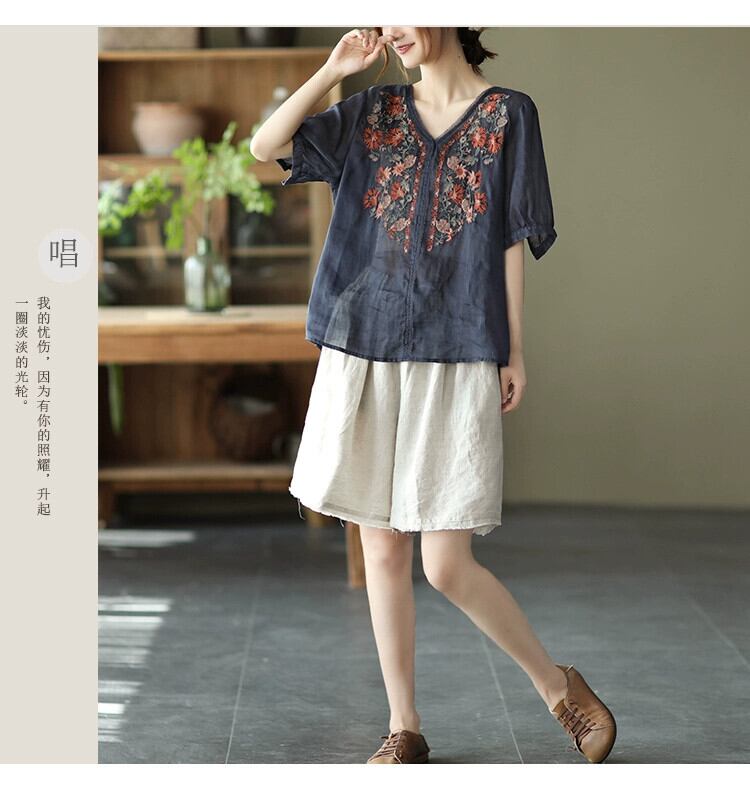 大きいサイズの女性の綿とリネンのシャツ Tシャツ 2021 夏ルーズファット mm 西洋スタイルの刺繍薄手のリネンライトトップ レッド コットン 大きめサイズ サマー 夏物 sine42319588493