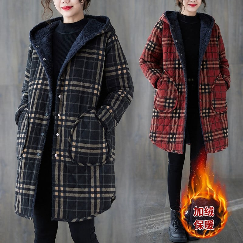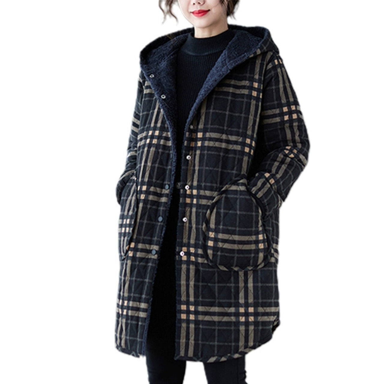 冬のキルティング厚みのある綿のコートの女性、ゆったりとした大きいサイズの太さのmmプラスベルベットの暖かいポケットレトロなチェック柄のミドル丈コート コットン 大きめサイズ ウィンター 冬物 sine5836630267