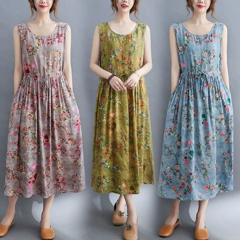 コットンとリネンのベストドレス女性の夏 2021 新しいルーズ大きいサイズモダンな花柄レースアップウエストワイド裾ミッドレングススカート 大きめサイズ サマー 夏物 sine92198731562