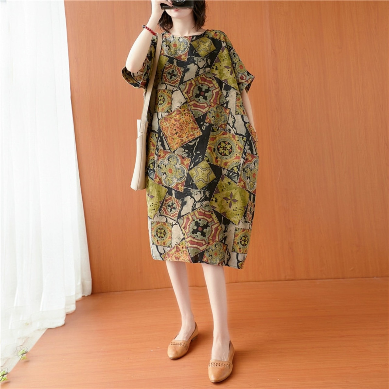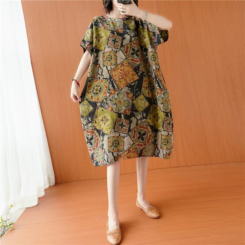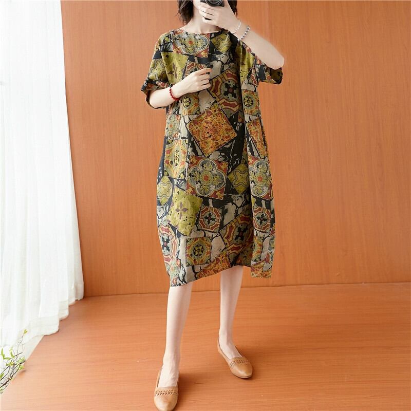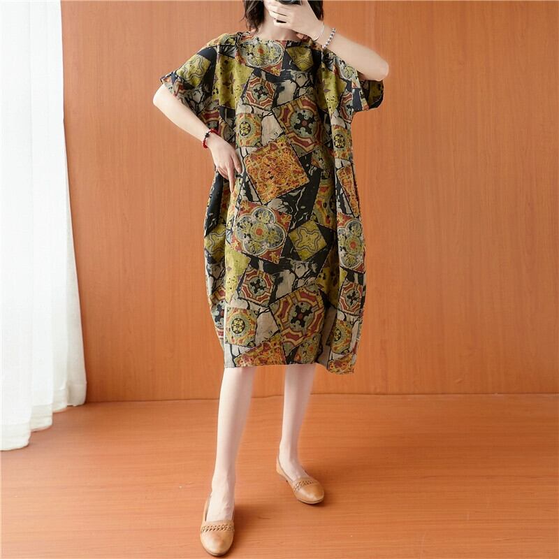 200 ポンドのレトロなプラスサイズの女性の 2021 年夏新しいルーズ プリント繭型腹カバー ミッドレングスの綿とリネンのドレス コットン 大きめサイズ サマー 夏物 sine76357658653