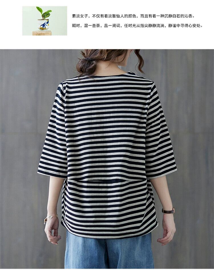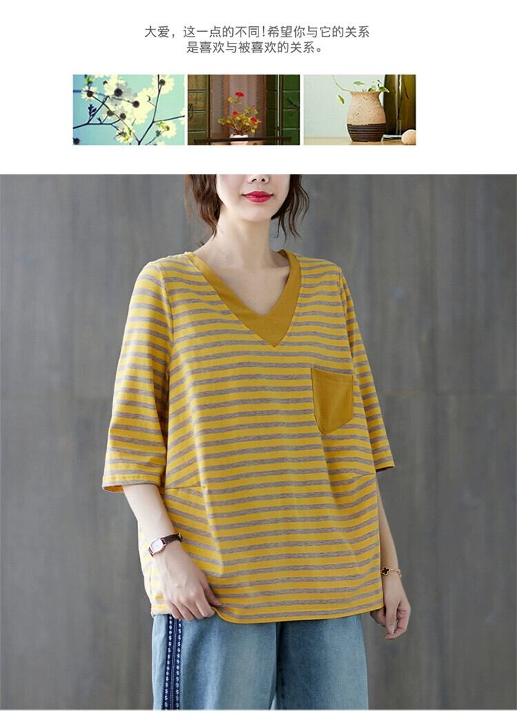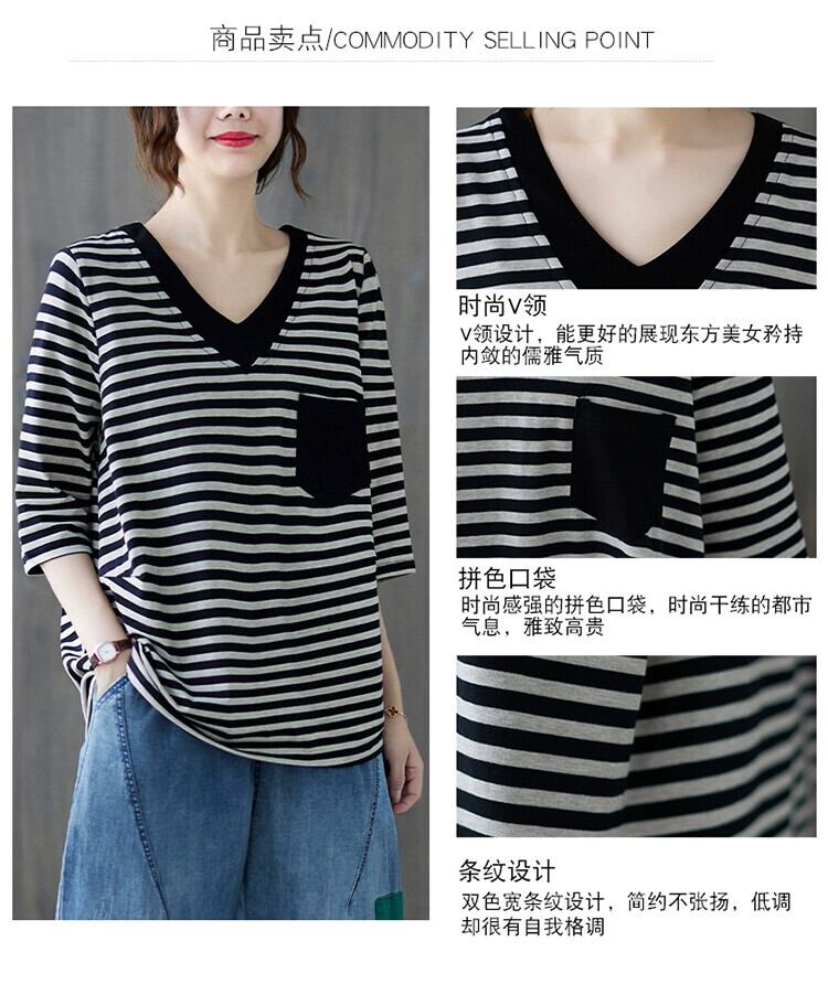ストライプ V ネック隠し肉 Tシャツ女性の夏 2021 新しい緩い脂肪 mm 年齢を減らす腹カバープラスサイズの女性の七分袖トップ 大きめサイズ サマー 夏物 Vネック sine7226038867