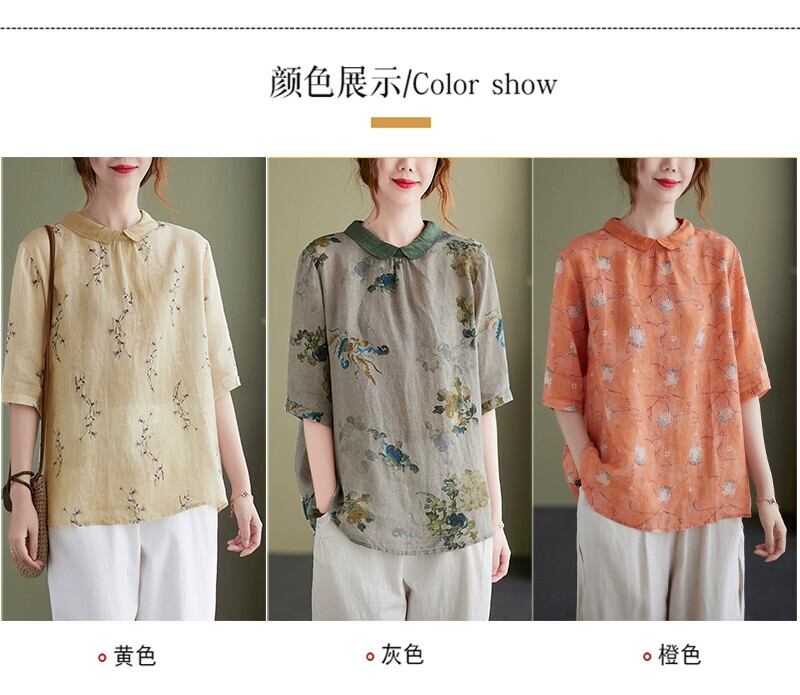 大きいサイズの女性の綿とリネンのシャツの女性の夏の 2021 新しい緩いレトロなプリント気質ラペルラミー Tシャツトップ コットン 大きめサイズ サマー 夏物 sine69145426518