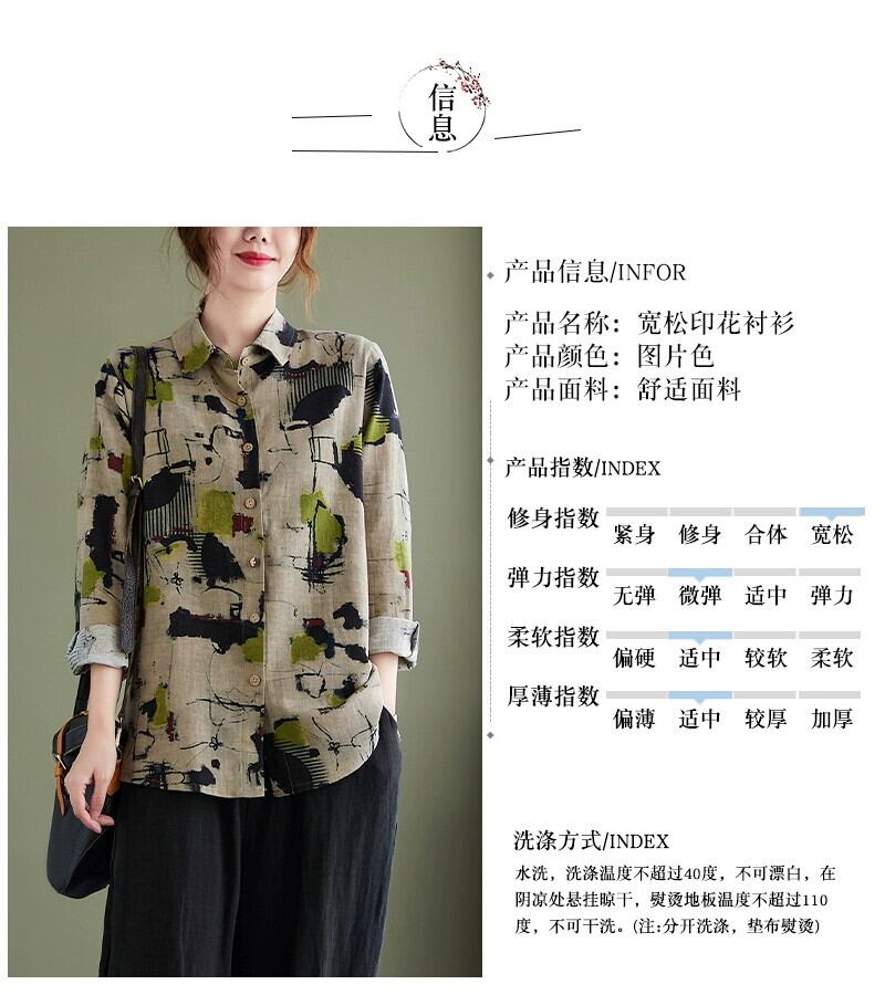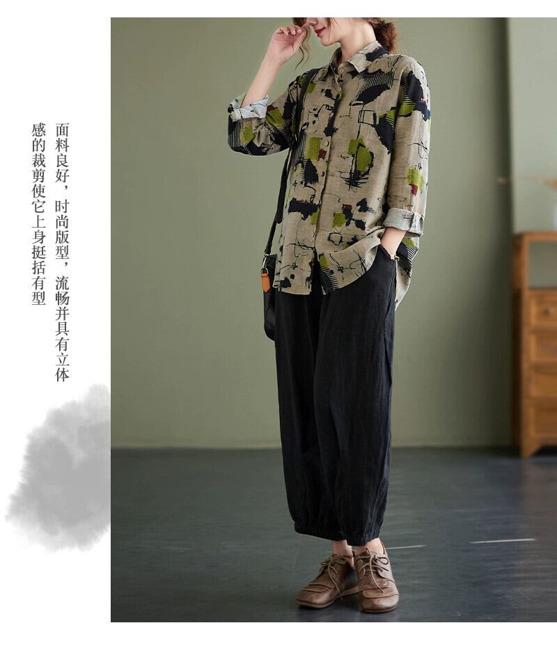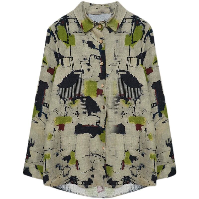 コットンとリネンの長袖シャツの女性 2021 秋の新ルーズ大きいサイズのレトロなプリント気質ラペルシングルブレストトップ ロング 大きめサイズ オータム 秋物 sine8627234108