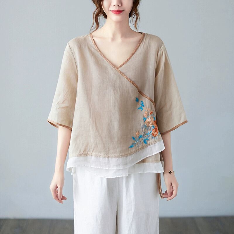 中国風の綿とリネンのシャツの女性の夏 2021 レトロプレートボタン刺繍 V ネックルーズ大きいサイズのリネン日焼け止めトップ レッド コットン 大きめサイズ サマー 夏物 Vネック sine16956208035
