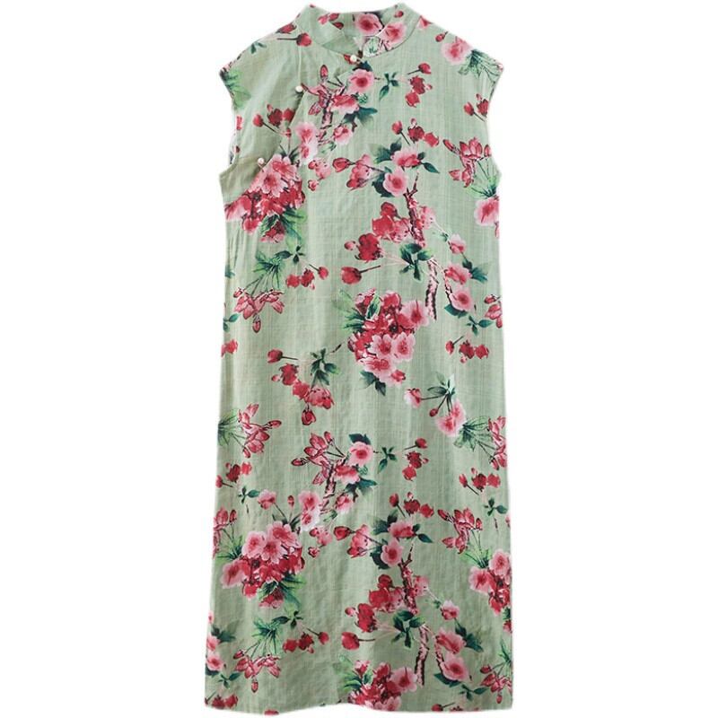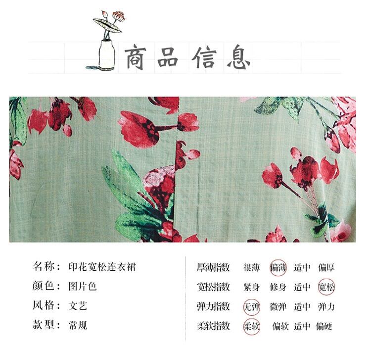コットンとリネンのドレスの女性の改良されたチャイナ ドレス ルーズ エスニック スタイル文学プリント Eign スタイル ルーズな大きいサイズ リネン ミドル丈スカート 大きめサイズ sine58333929001