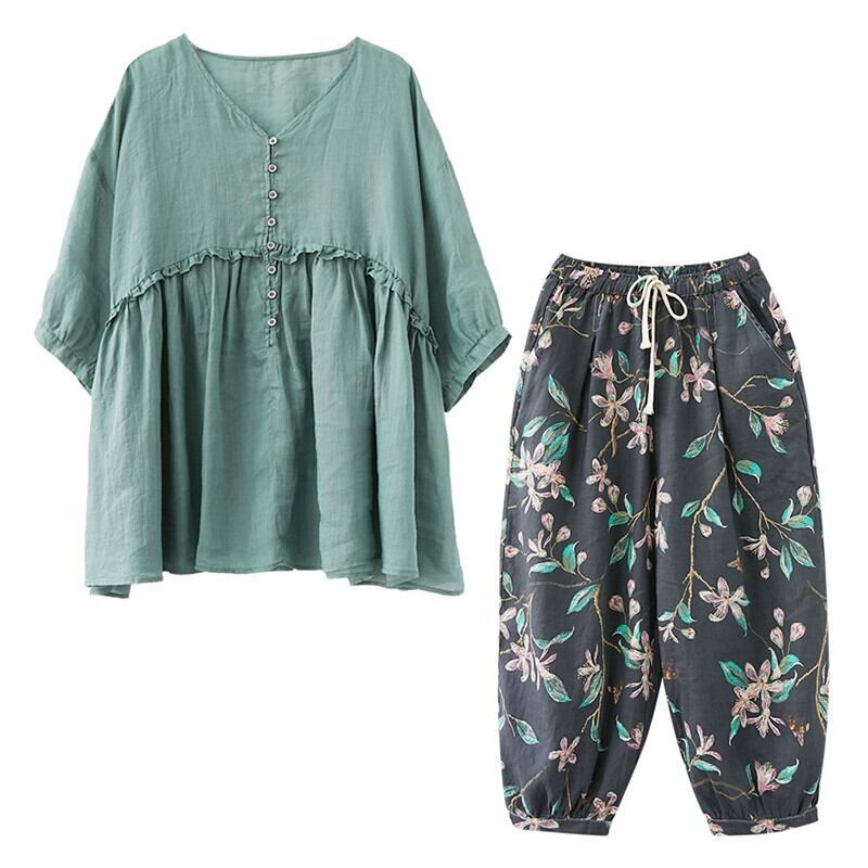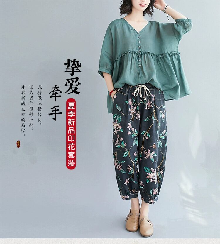 プラスサイズの女性の綿とリネンのツーピース夏ファットミリメートルイヤリング Tシャツトップカジュアルパターンハーレムパンツリネンスーツ コットン 大きめサイズ サマー 夏物 sine38786169978