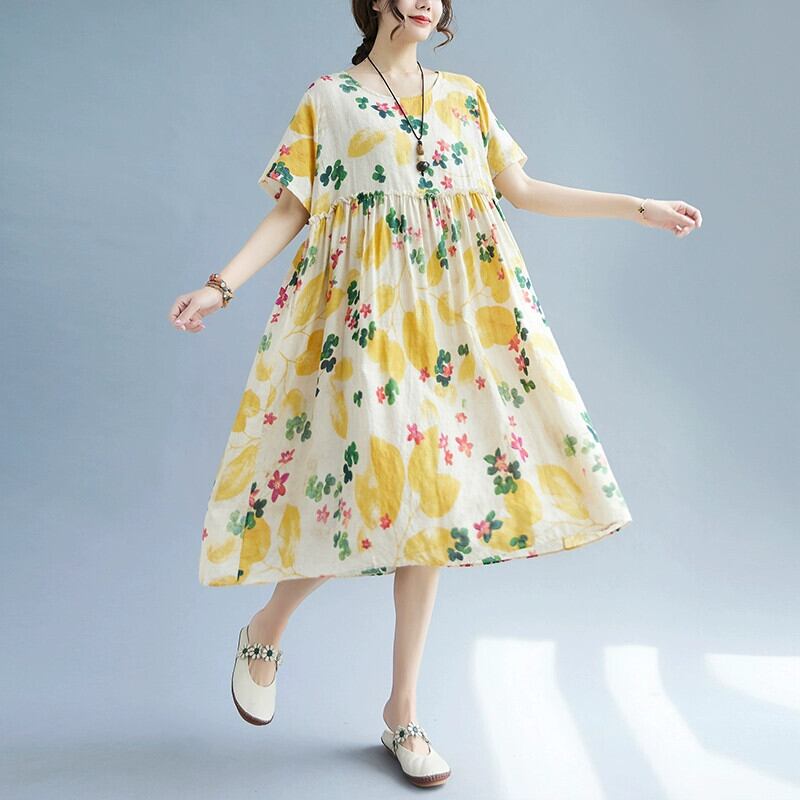 プラスサイズの女性のレトロなプリントドレス夏ゆるい脂肪mmスプライシングでお腹をカバーし、スリムなAラインのコットンとリネンのミドル丈スカートを作ります。 大きめサイズ サマー 夏物 sine9385889713